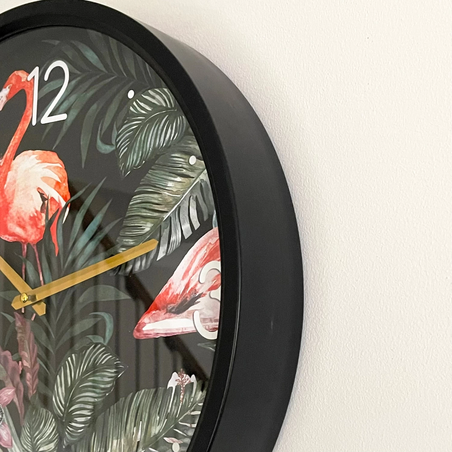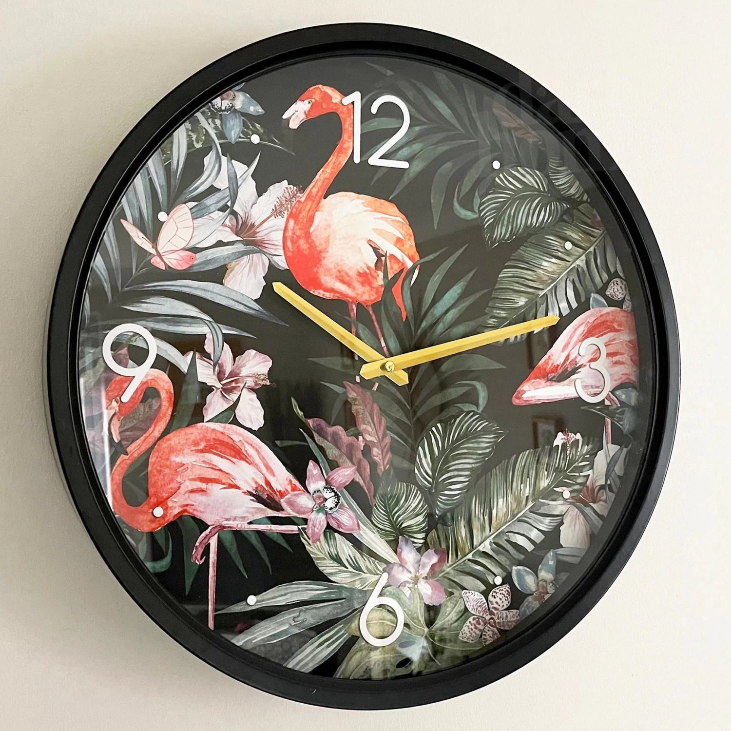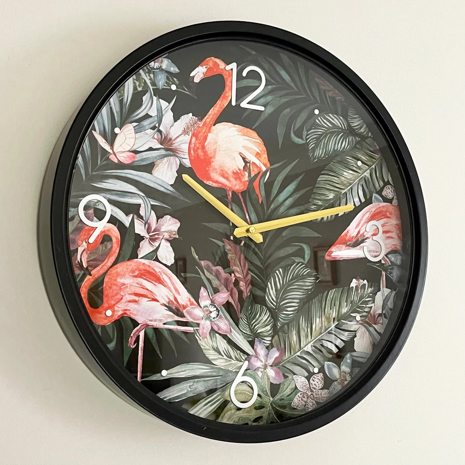 This modern wall mounted clock boasts a tropical flamingo face design. This is a wall mounted battery powered clock with a round face and is suitable for indoor use only.