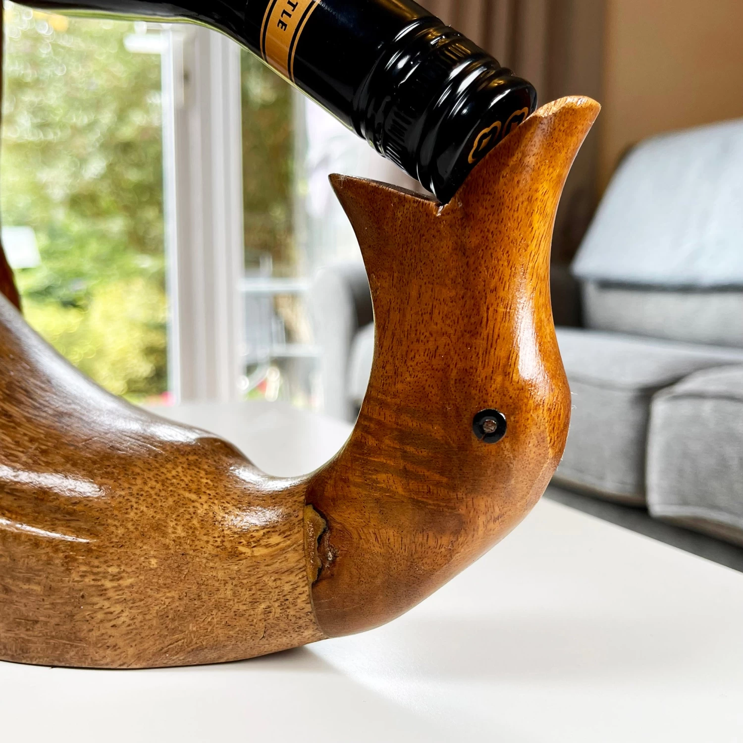 A quirky drunken duck single wine bottle holder in a rustic natural wooden design. Wooden made novelty decoration that will look great on a kitchen worktop to keep your chosen bottle neatly placed and available to use whenever needed. Hand carved bottle holder made in Indonesia.