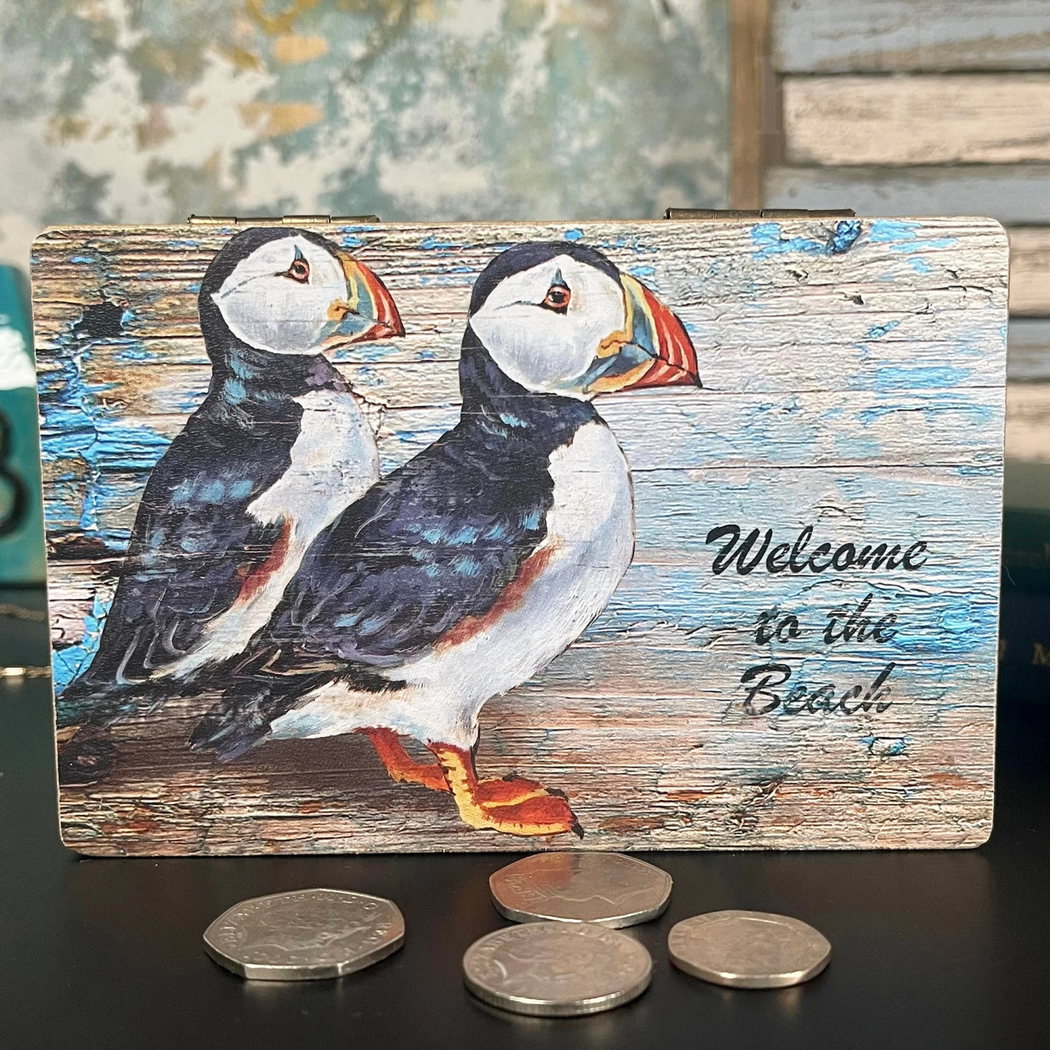 An antique style trinket box featuring a beach themed puffin pair design. Small rectangular pot with lid. Perfect for bedside decoration to store your valuables and small bits and bobs.