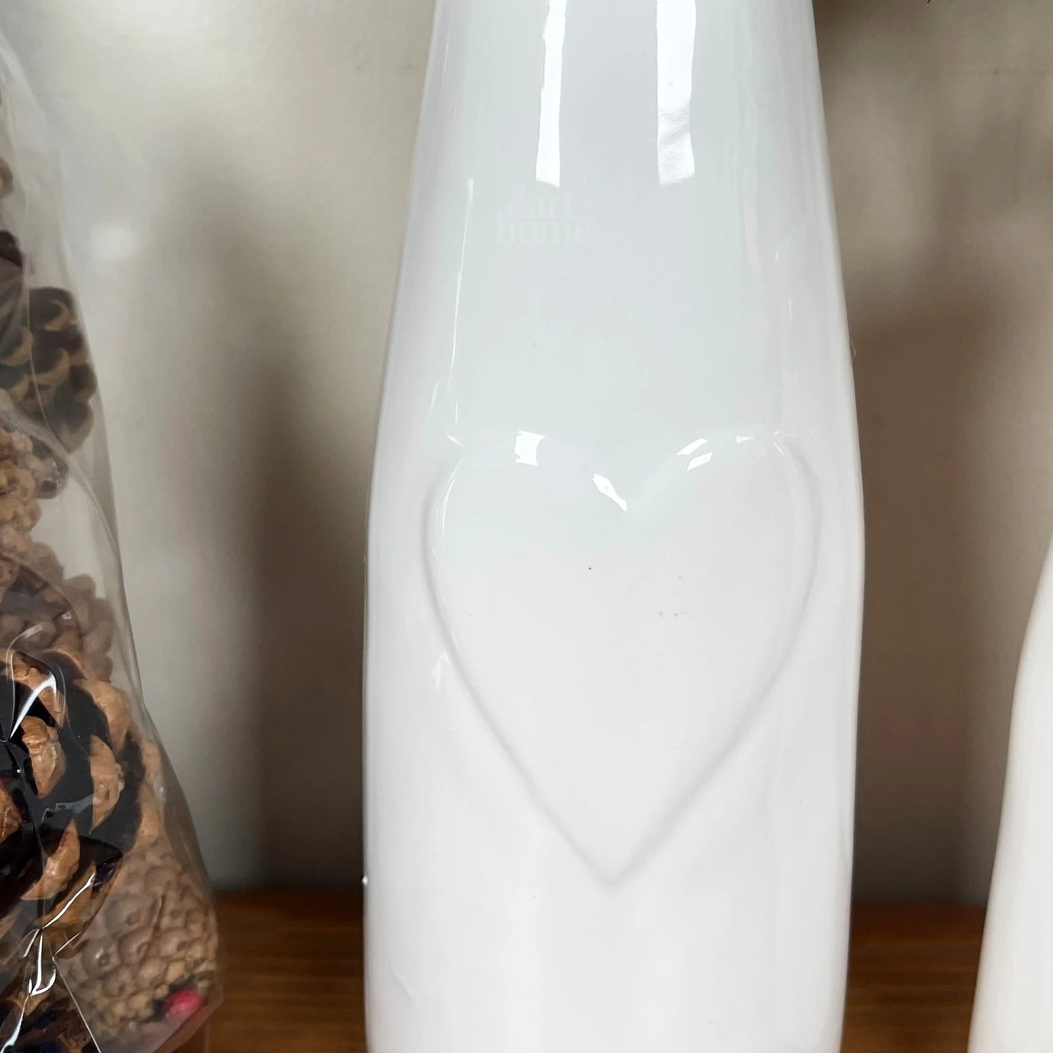 Perfect for sprigs of real or fake floral decoration, these bottle vases featuring a pretty embossed love heart on each will look beautiful on a wedding or dining table in a neutral or country home. This is a set of 2, coming with a large bottle and small bottle.