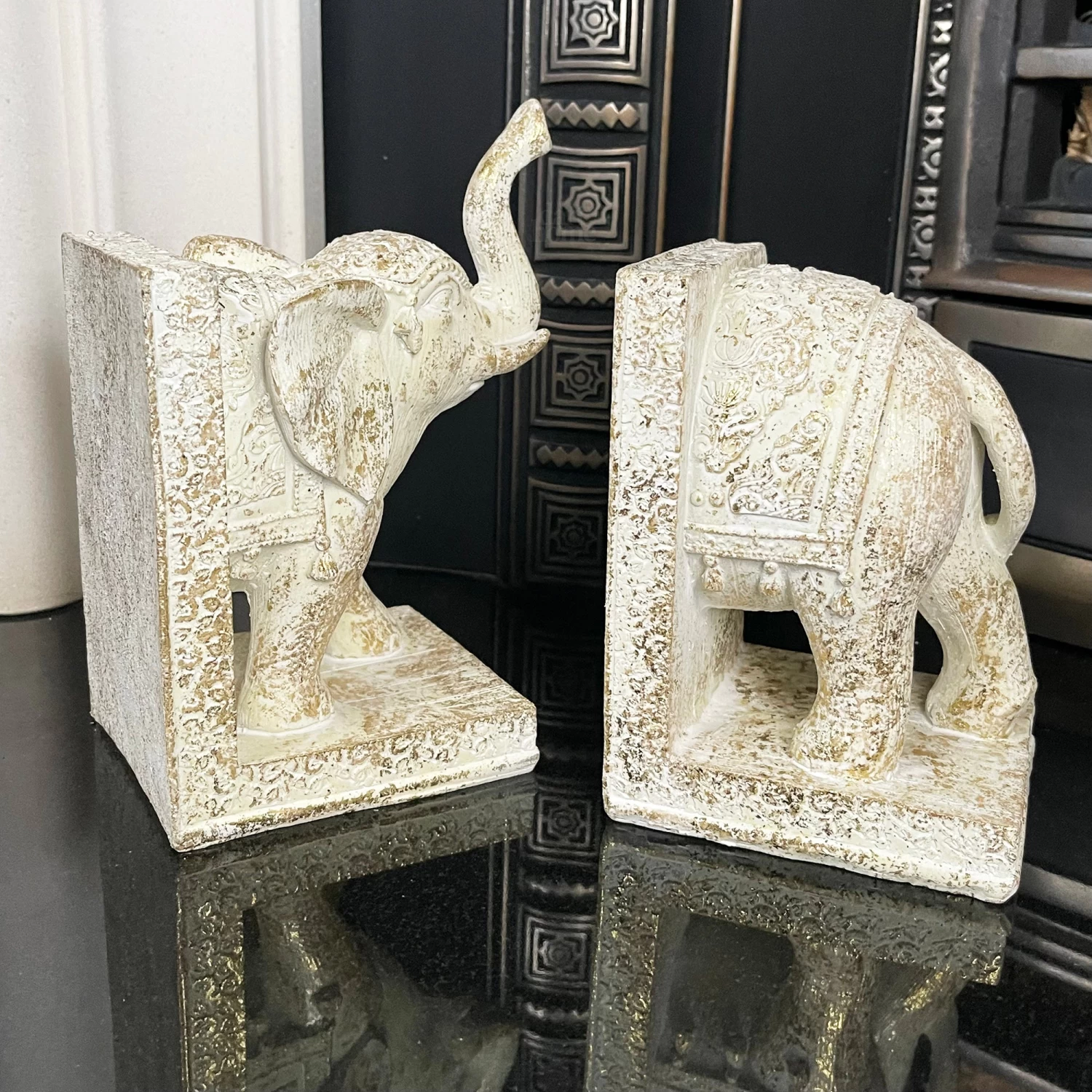 The pair of novelty bookends; including the front and back of an elephant upon a square base, have a detailed indian style finish which will easily fit into your existing neutral decor. They are a must have for your living room or bedroom.