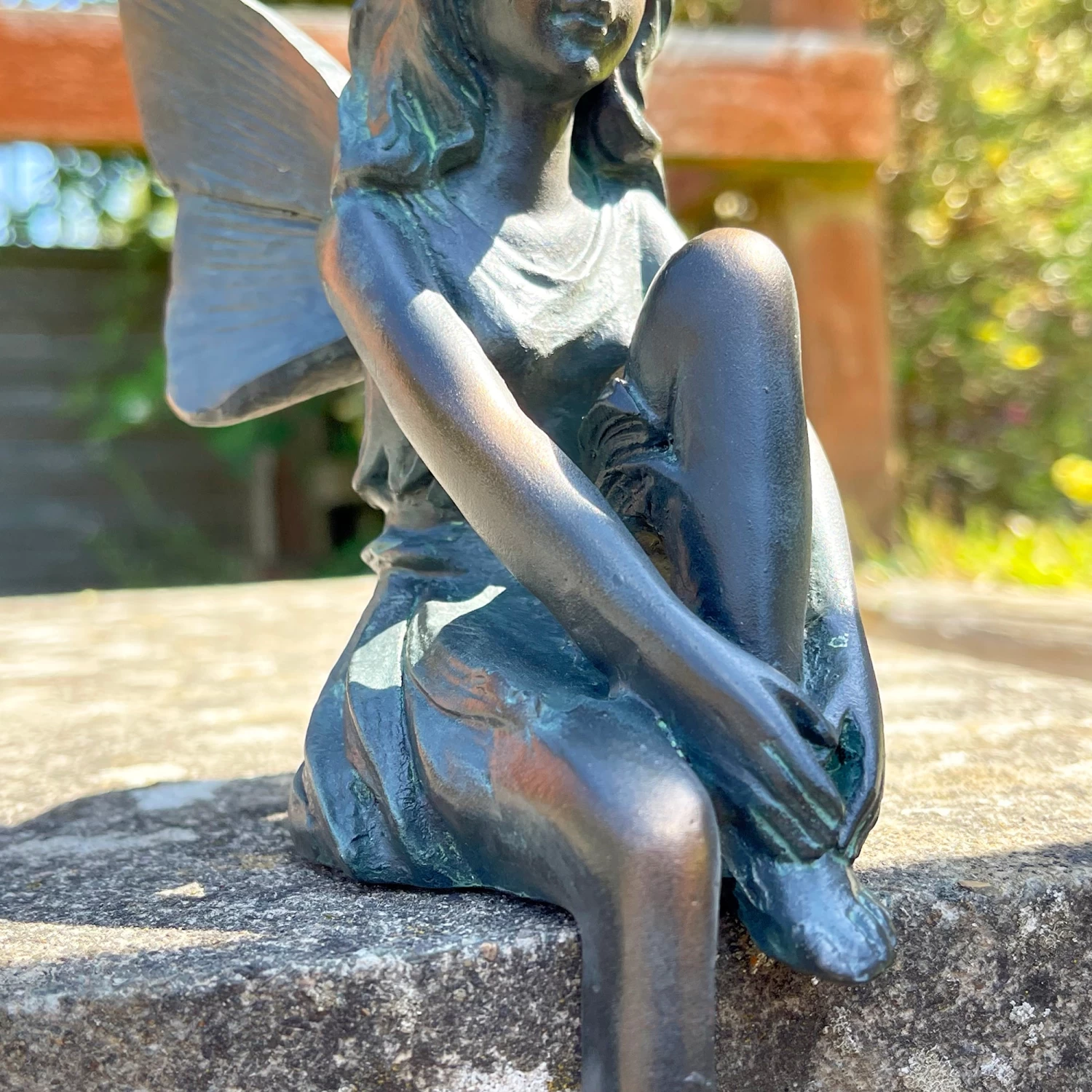This beautiful magical seated angel lady is shelf sitting and can either be placed indoors or outdoors. The sitting fairy girl has a bronze effect finish with a green and gold tint and is made from high quality resin. It will be a lovely addition to your home and garden.