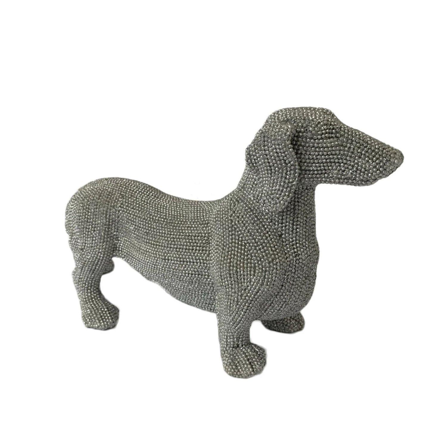 This bling silver sausage dog has been beautifully made with a sparkly finish and decorated with glitter diamantes. This is a freestanding piece made for indoor use only. It is a perfect shelf sitter for the home.