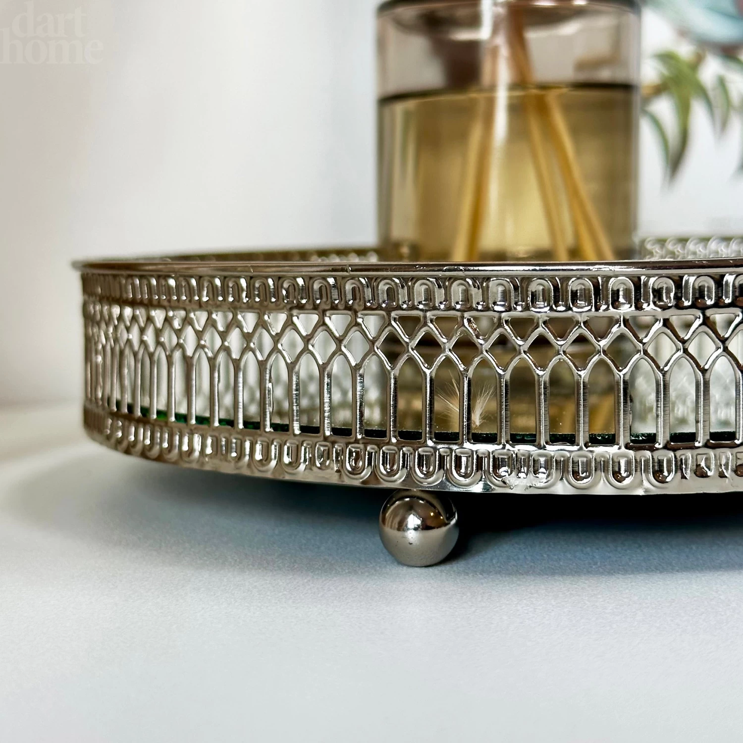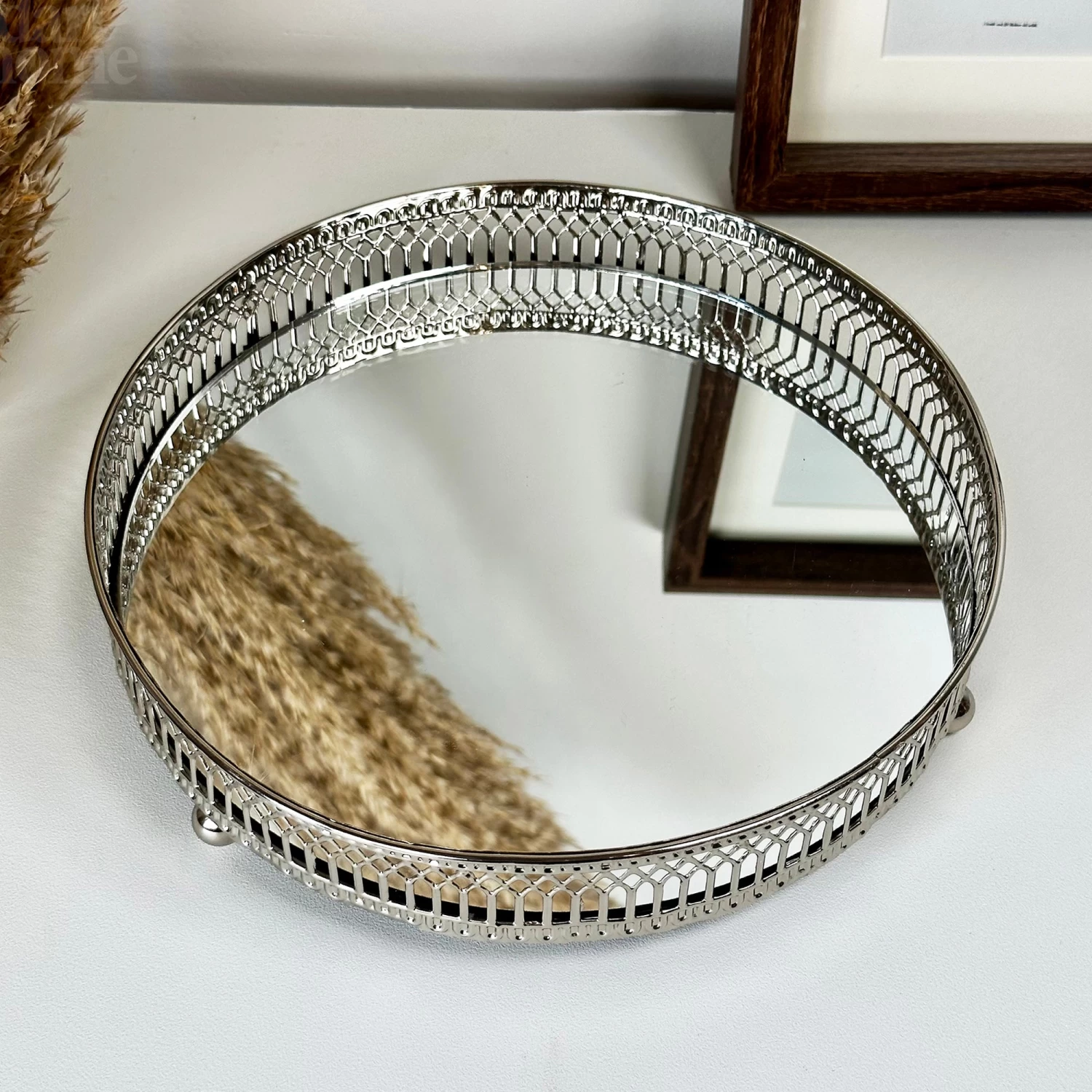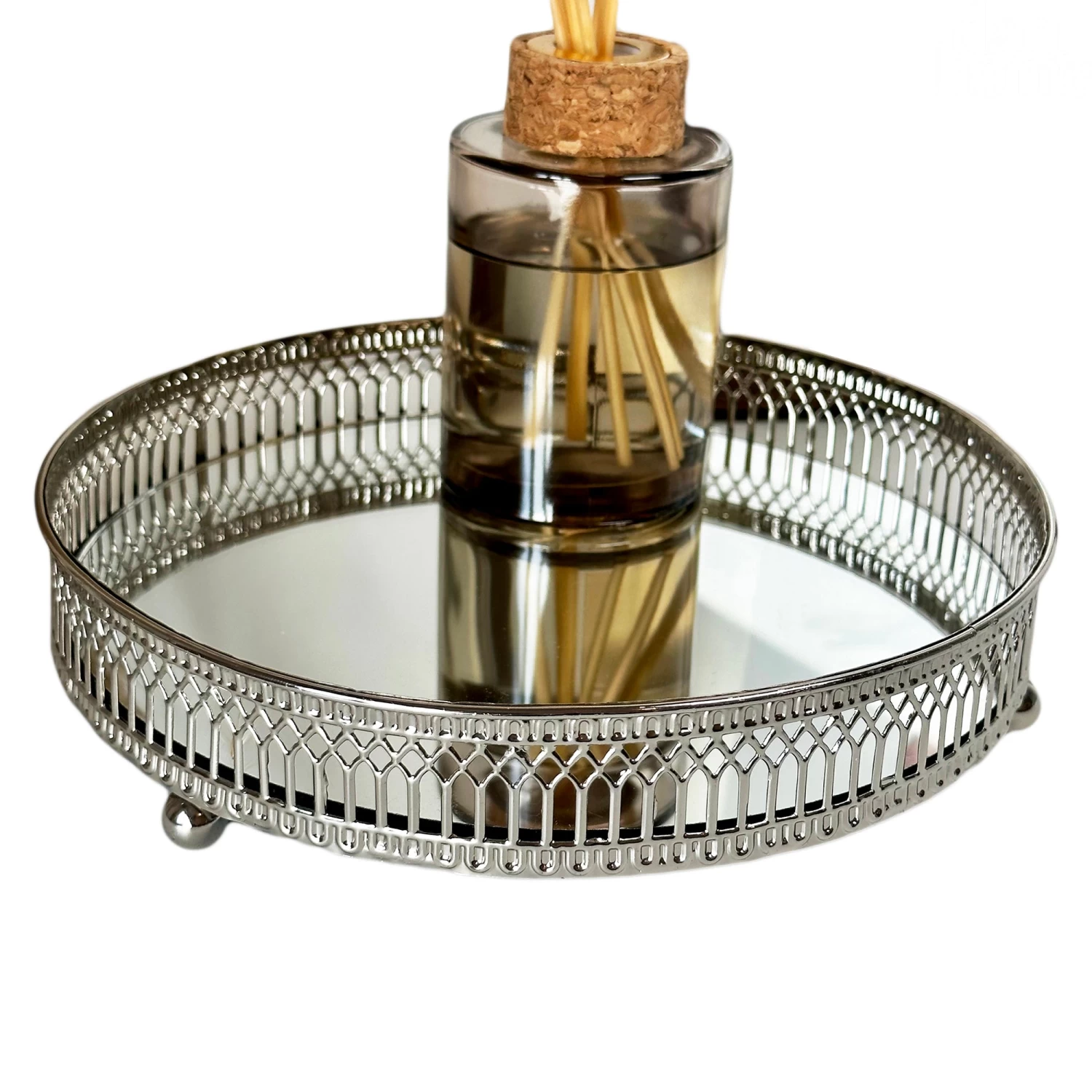 Featuring a silver metal frame with an ornate pattern and a mirrored base, this round candle plate will bounce light around the room and be a focal point wherever it is placed.
