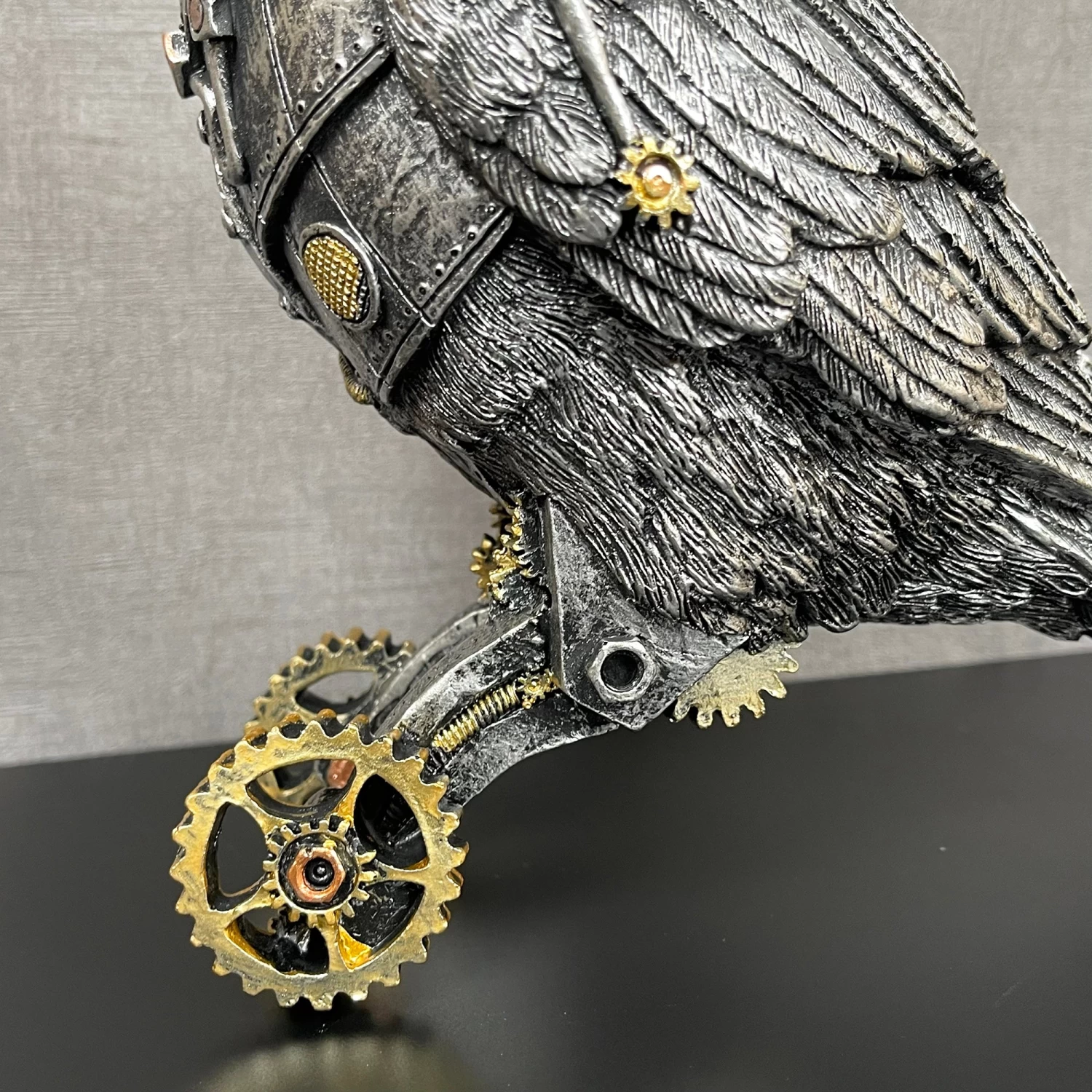 This is a fantastic steampunk themed resin silver sitting bird statue. It is finished with a distressed silver colour with bronze, gold and silver finished mechanical parts. Brilliant gift idea for the sci-fi, gothic and fantasy lovers out there.