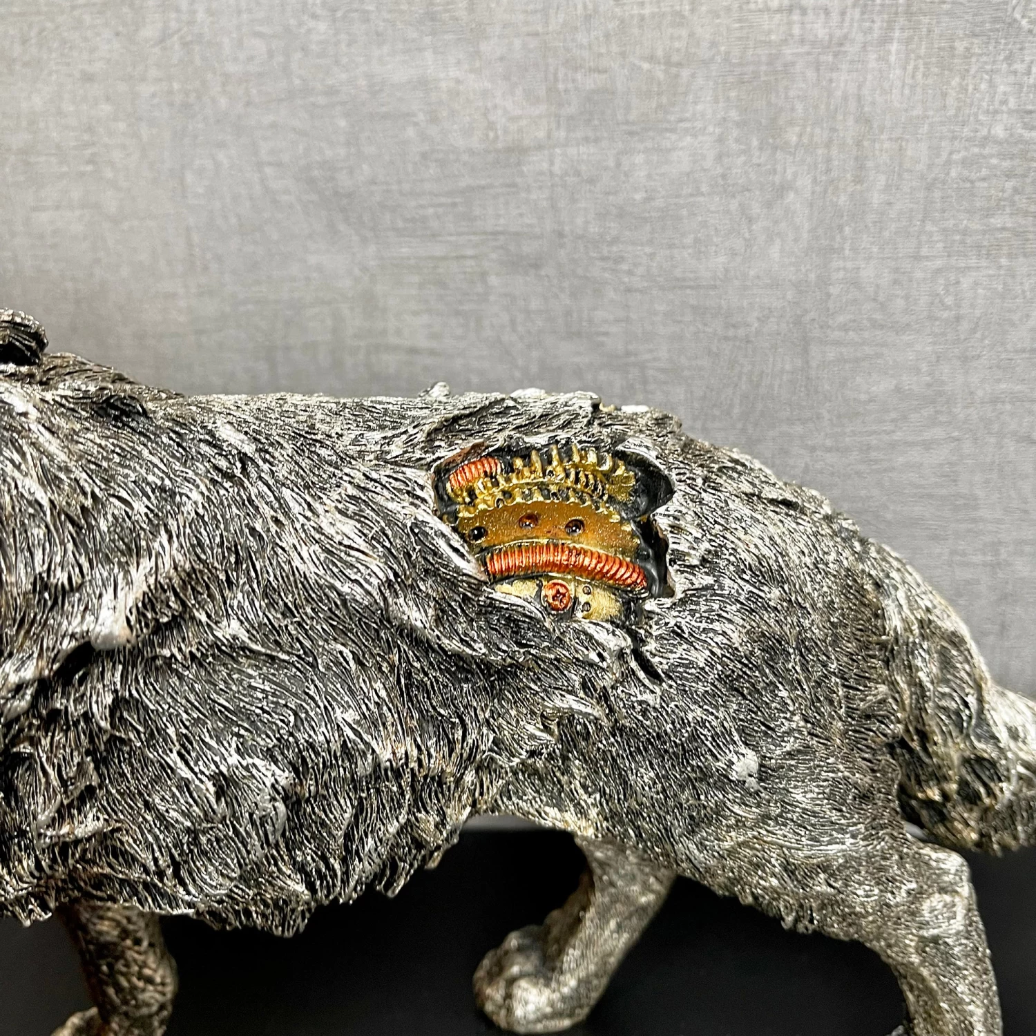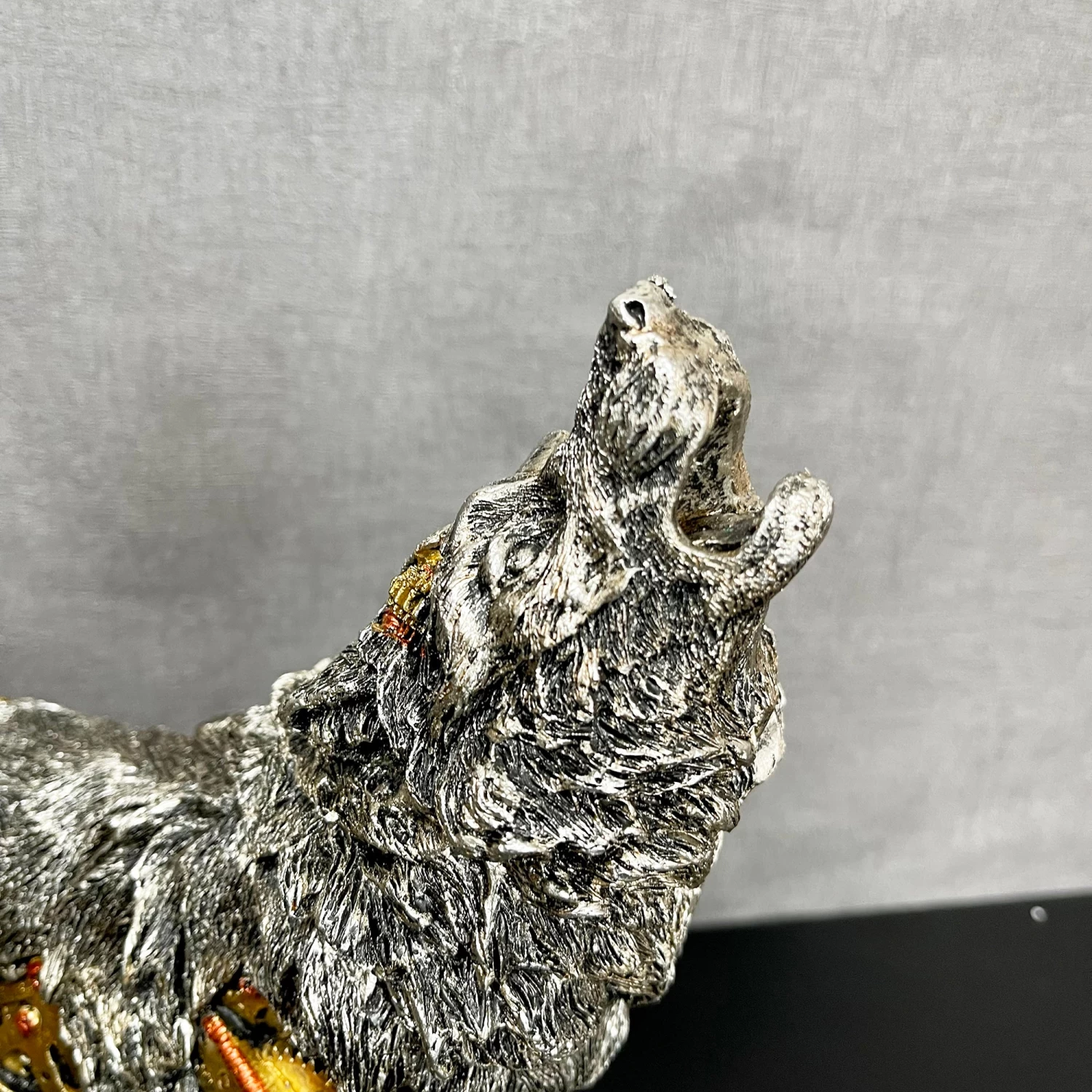 This is a fantastic steampunk themed resin howling wolf statue. It is finished with a distressed silver colour with bronze and golden finished mechanical parts. Brilliant gift idea for the sci-fi lovers out there.