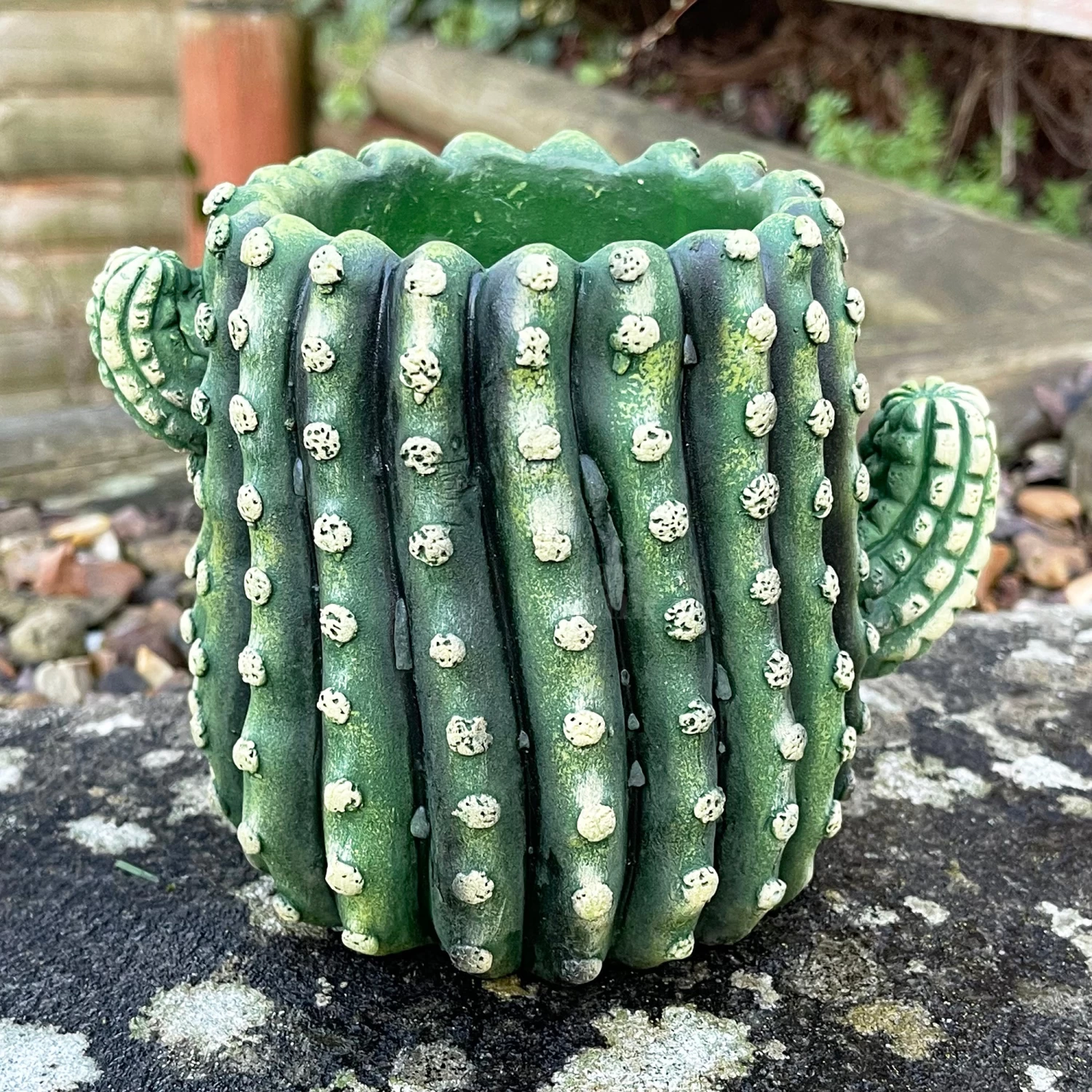 Cement green cactus planter with intricately detailed paintwork to bring this Cactus Plant to life in your garden. This pot has an approx 700ml capacity with a drainage hole and plug included suitable for indoor and outdoor purposes.