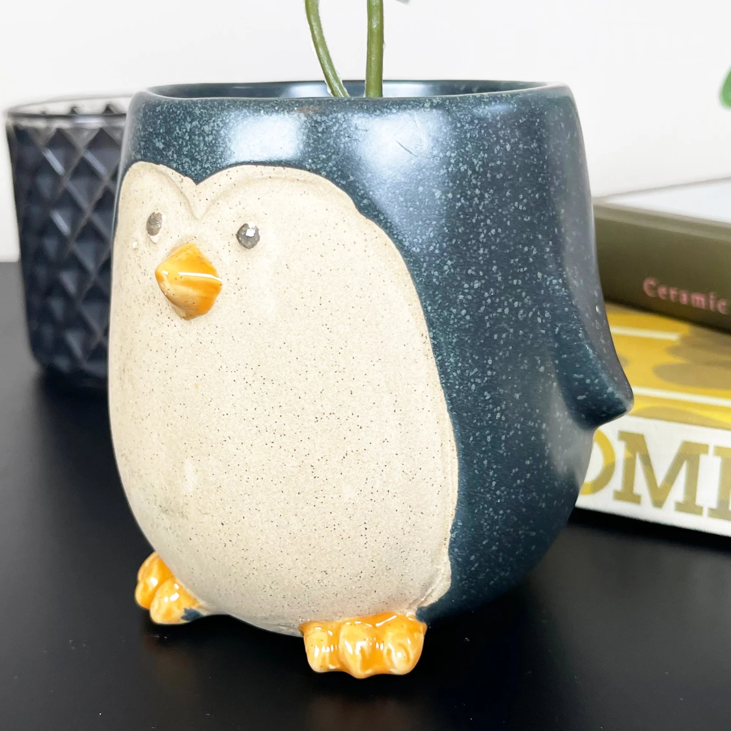 This cute penguin plant pot cover comes in a coloured blue and white design with a speckled finish. This round plant pot is an indoor only decorative pot perfect for small succulents or flowers that adds character to any room.