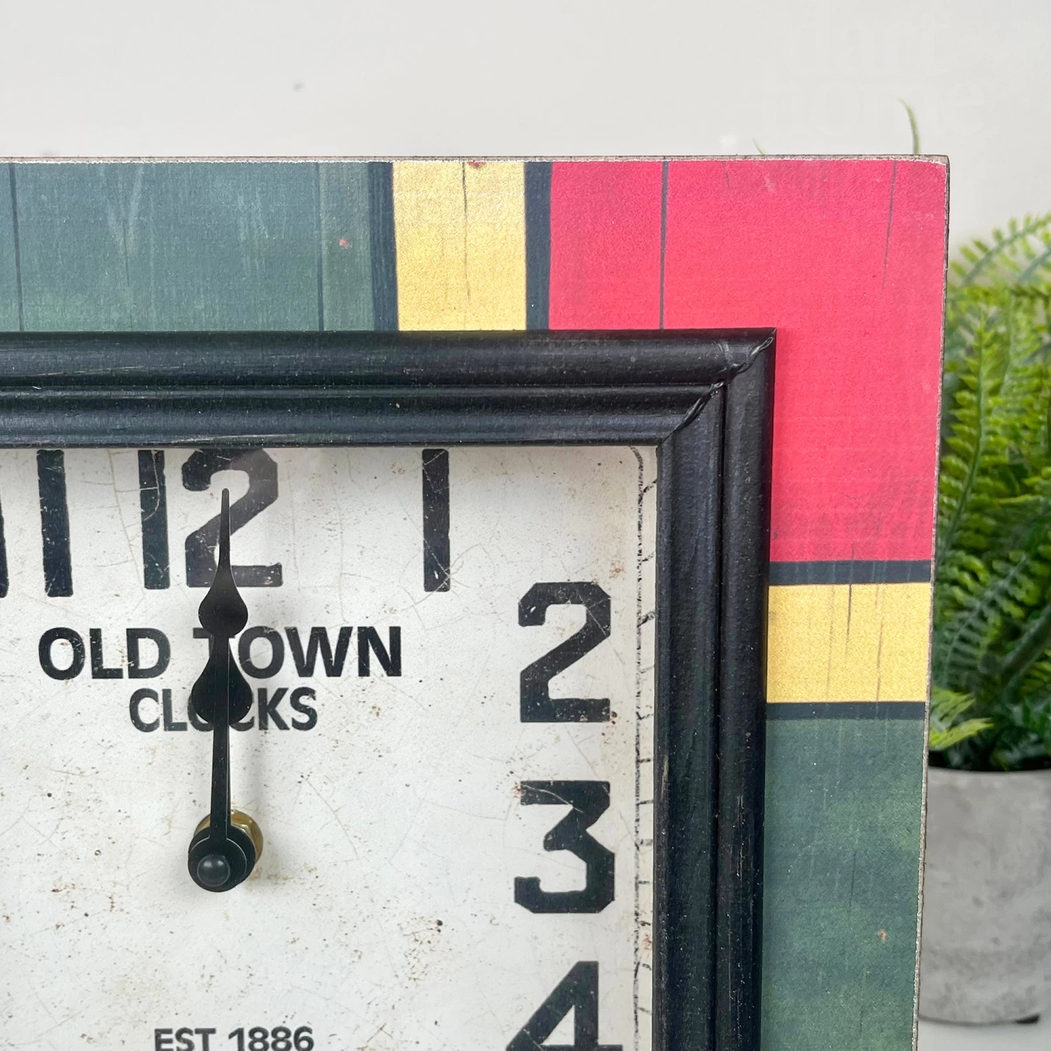 A square retro clock with a colourful (red, blue and yellow) wooden frame and a square glass face. Boasting a glass face with a 12 hour analogue display, this battery powered freestanding clock will be a neat feature to your home office desk to fulfill your time keeping needs whilst staying on trend.