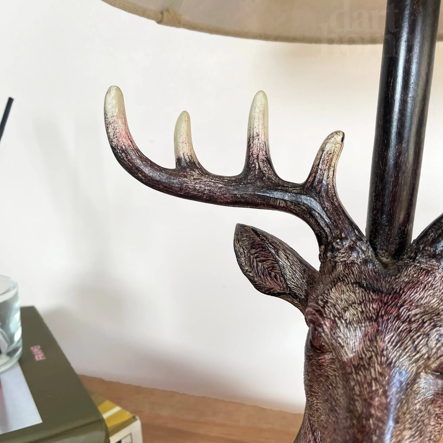 Retro style bedside lamp perfect as a reading light. Brown rustic stags head design made from resin with a white linen round shade, offering a warm white light when the light switch is turned on. 1 Bulb capacity, wall plug-in and on/off switch to control, black round stand.