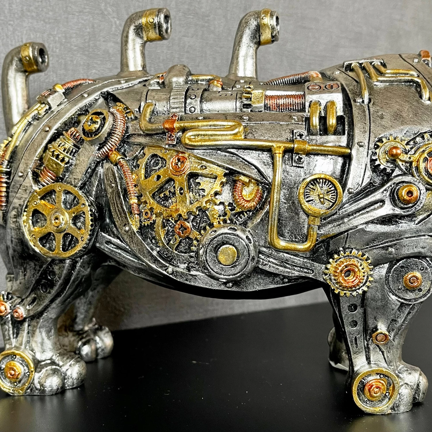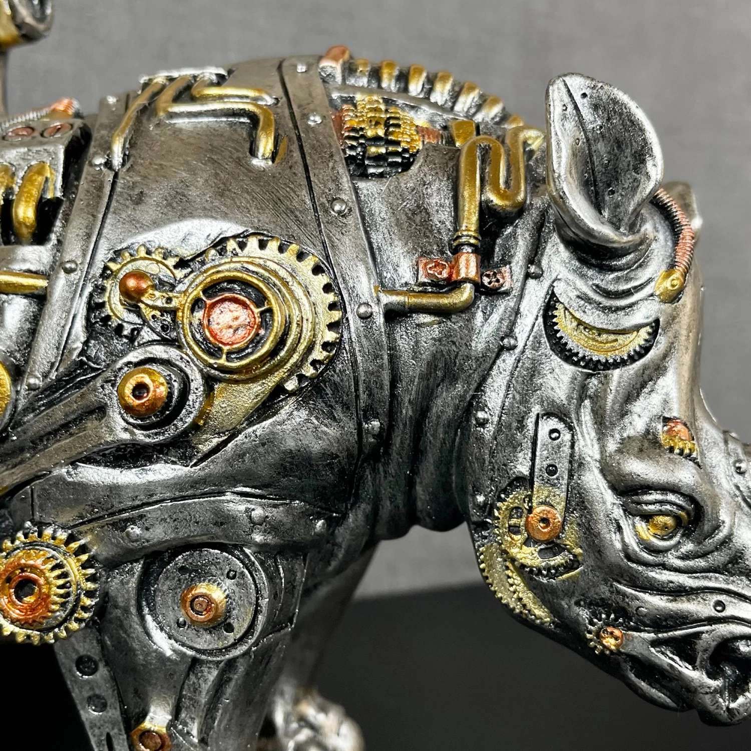 This is a fantastic steampunk themed resin silver standing rhinoceros statue. It is finished with a distressed silver colour with bronze, gold and silver finished mechanical parts. Brilliant gift idea for the sci-fi, gothic and fantasy lovers out there.