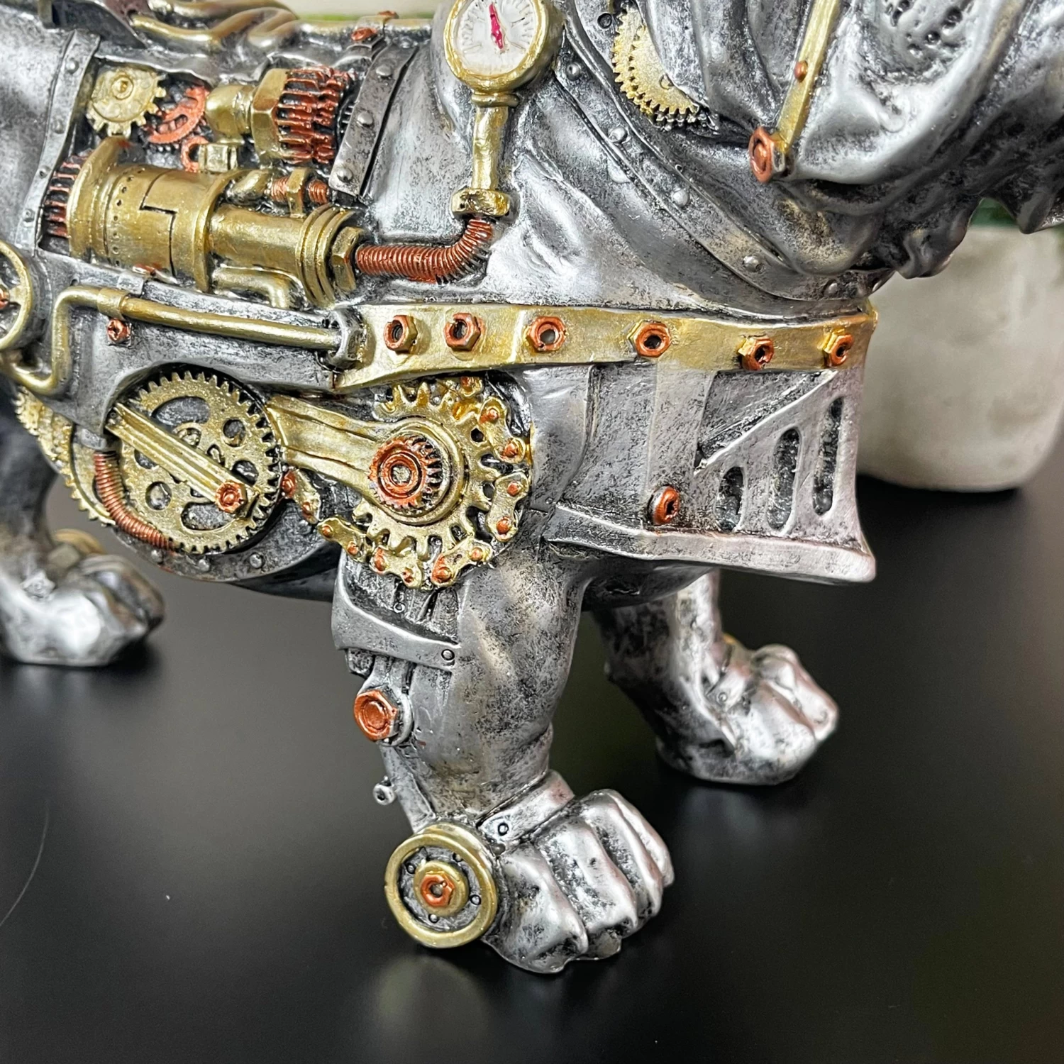 This is a fantastic steampunk themed resin silver standing dog statue. It is finished with a distressed silver colour with bronze, gold and silver finished mechanical parts. Brilliant gift idea for the sci-fi, gothic and fantasy lovers out there.
