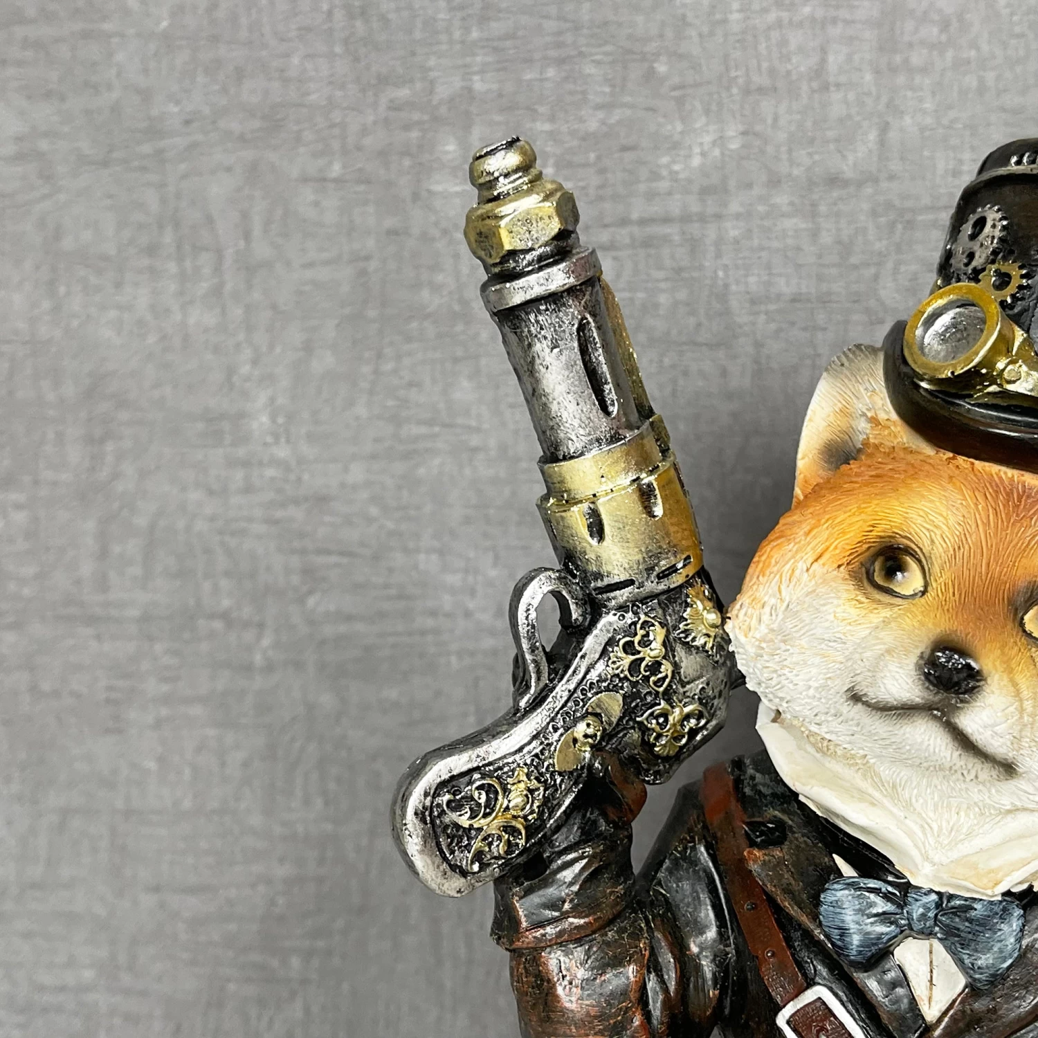 A quirky steampunk ornament featured a retro gentleman fox suited and booted ready for the occasion. This industrial styled woodland animal in a sci-fi gothic outfit is a neutral coloured statue perfect for halloween decoration in your bedroom or man cave.