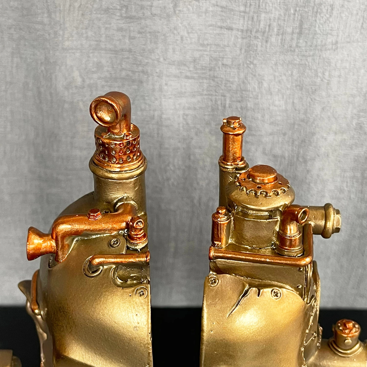 These heavy duty steampunk bookends feature a robotic man and a skull. They are finished in a metallic gold with bronze decorative pieces and are ideal for keeping your shelves tidy and your books in place.