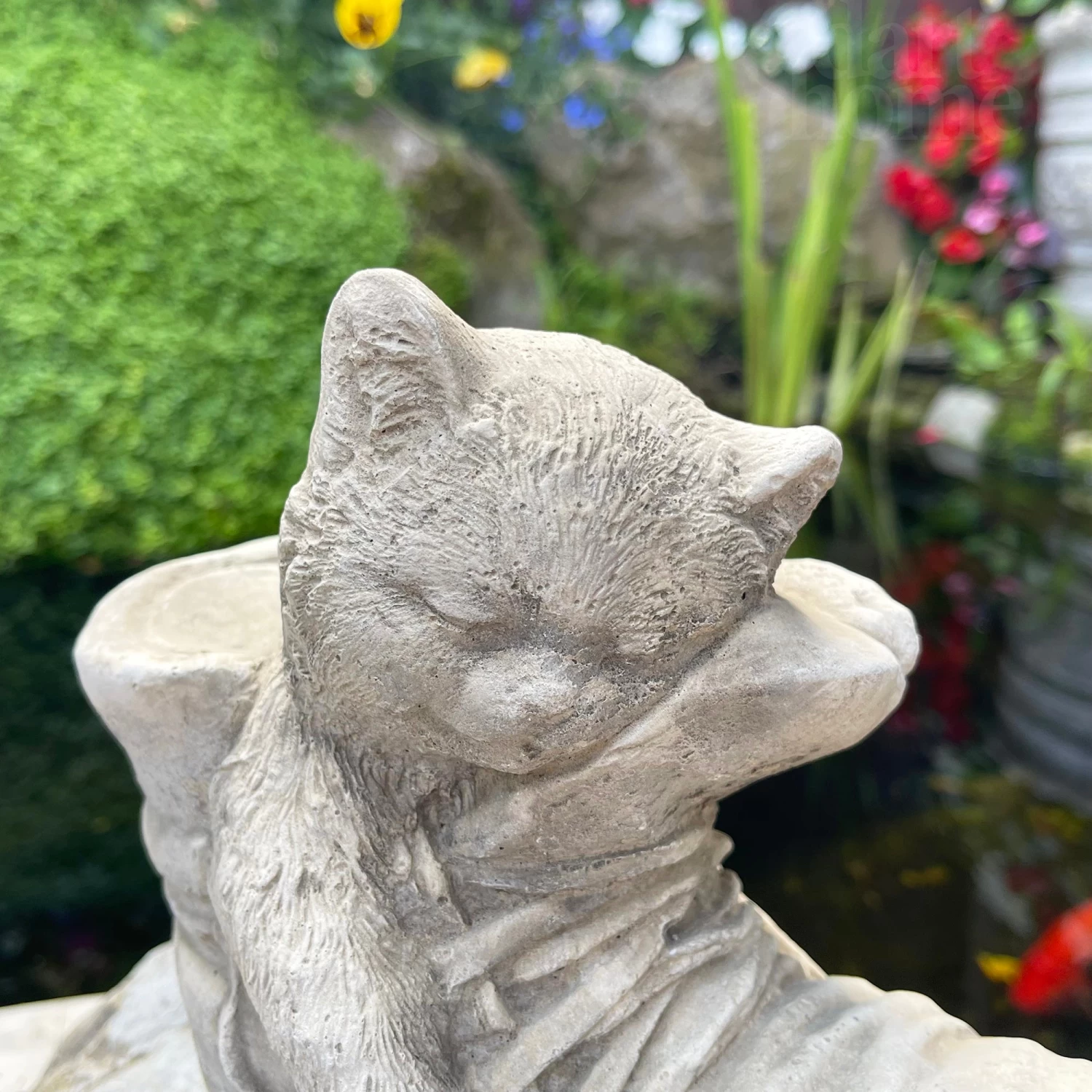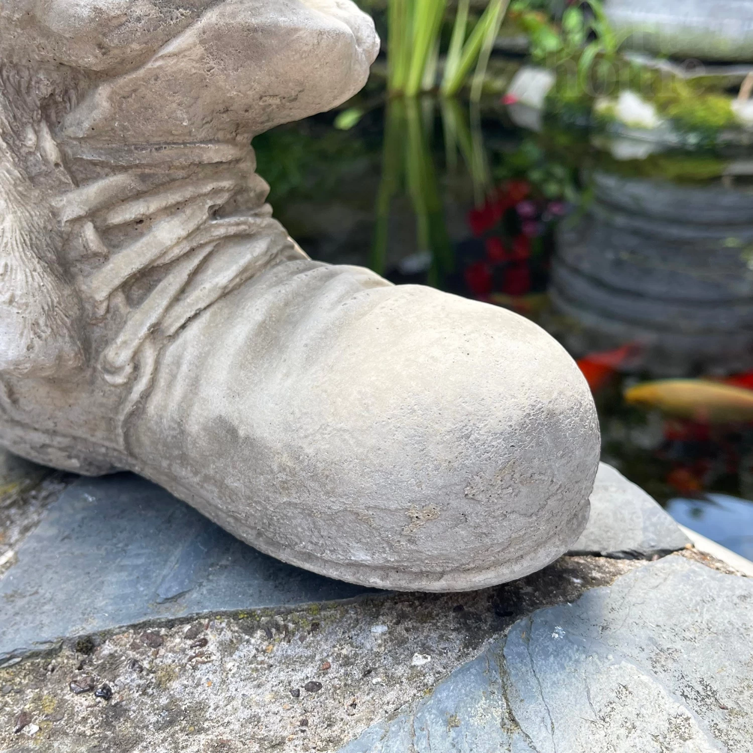 A garden stone sculpture featuring a Cat In Boot design. Handmade in the UK using stone. This garden ornament showcases intricate textured detailing which brings this piece to life. The antique grey coloured stone is weather resistant suitable for year-round decoration and will enhance any natural landscape.