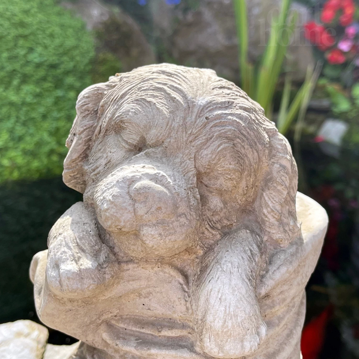 A garden stone sculpture featuring a Puppy Dog In Boot design. Handmade in the UK using stone. This garden ornament showcases intricate textured detailing which brings this piece to life. The antique grey coloured stone is weather resistant suitable for year-round decoration and will enhance any natural landscape.