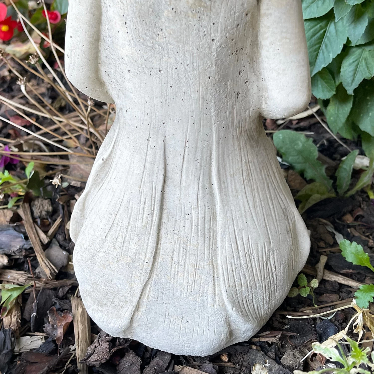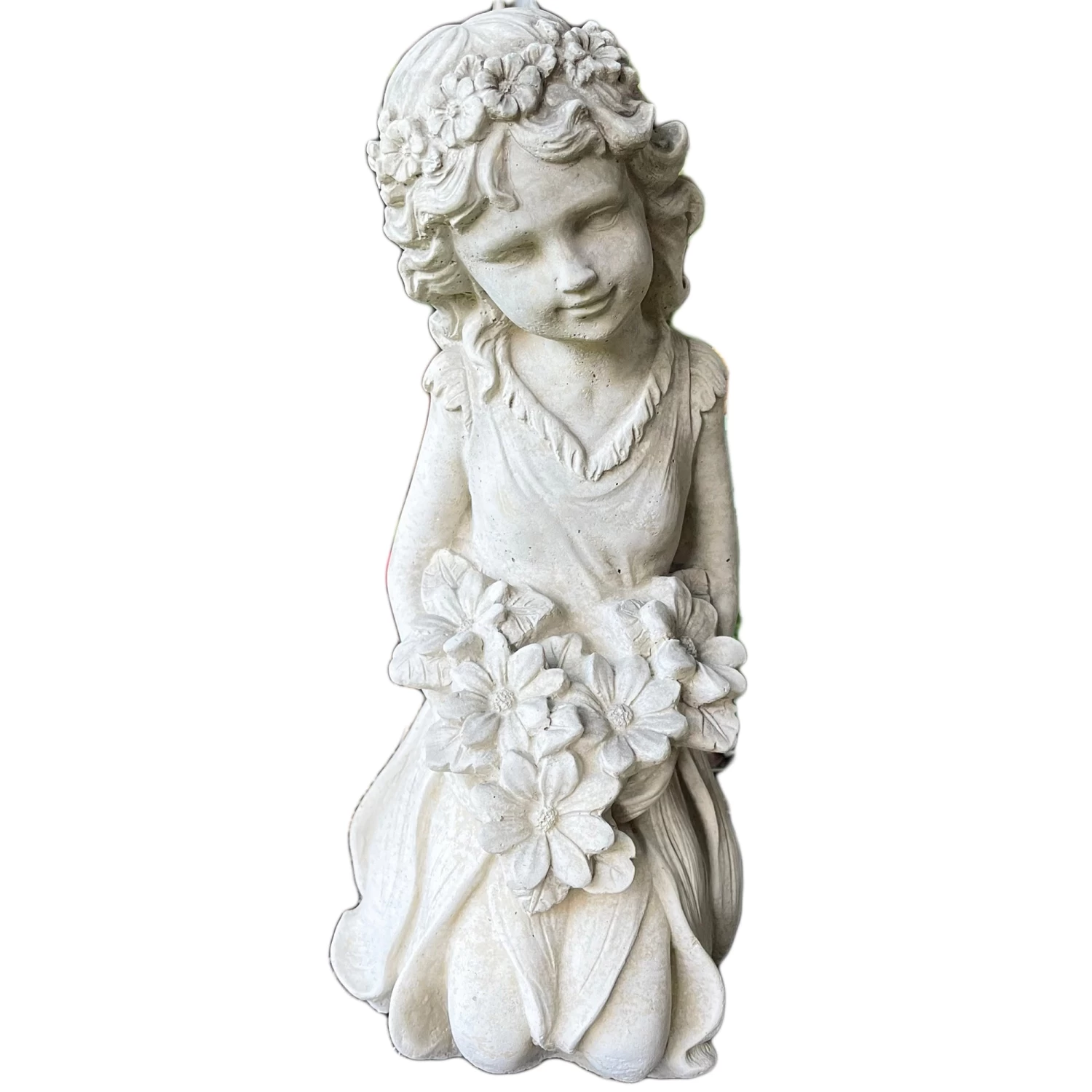 This grey stone kneeling flower girl featuring floral decorations is hand crafted in the UK and would make a great addition to any garden. The antique grey coloured stone is weather resistant suitable for year-round decoration and will enhance any natural landscape.