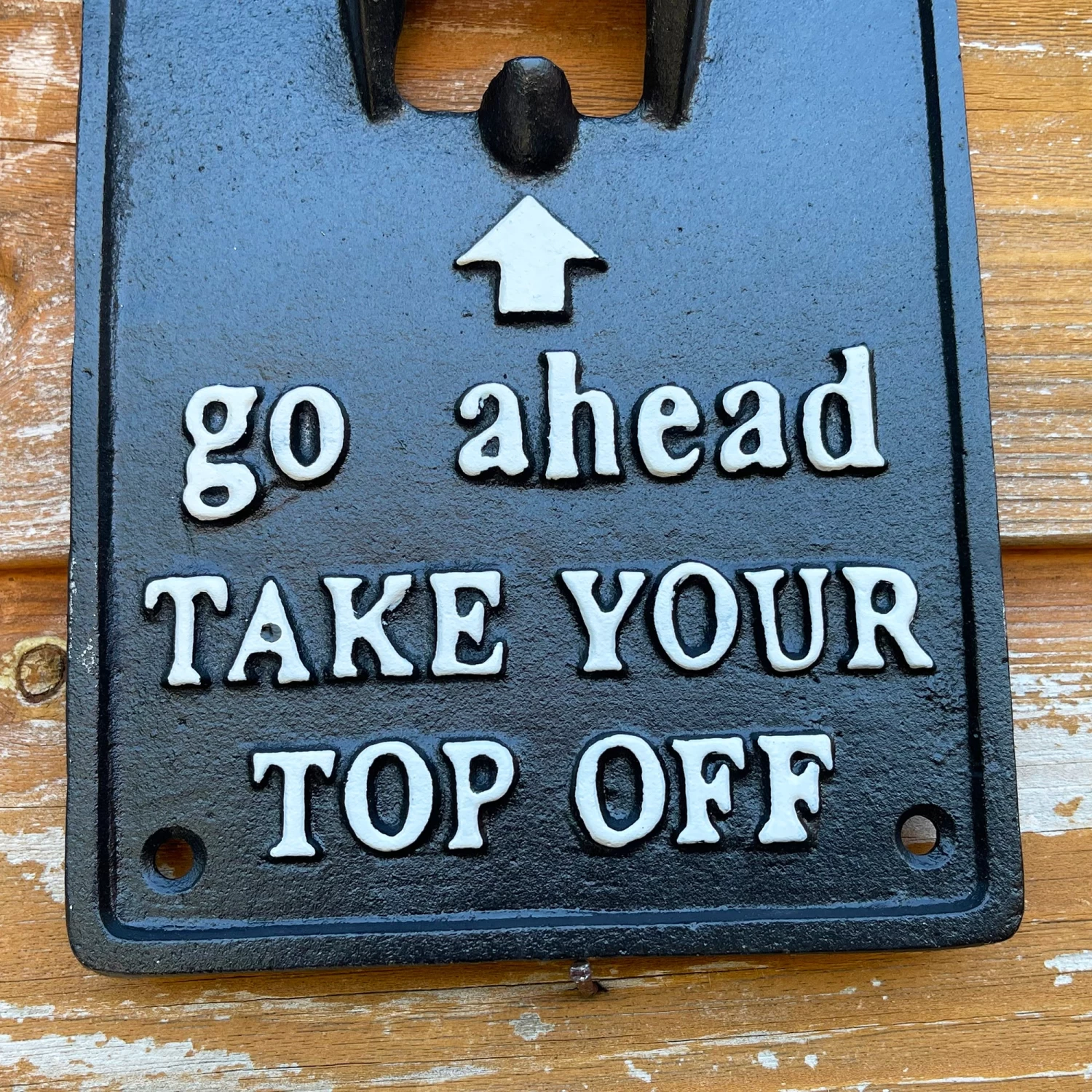 This novelty wall mounted single bottle opener is an incredibly convenient product that every party host needs in their garden. Make your friends laugh whilst they open their drink with embossed white lettering reading ‘Go ahead take your top off’.
