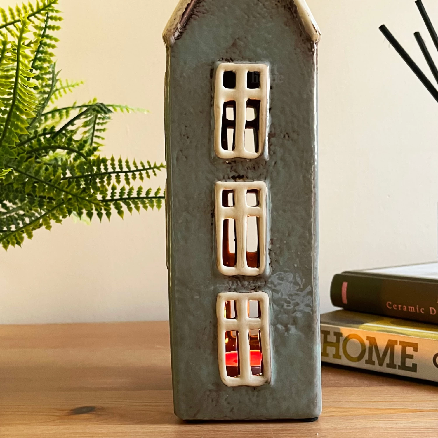 This perfect large ceramic village cottage house candle holder is delocately made and painted to perfection in a dark grey shade with an off white roof. It will look great in any setting.
