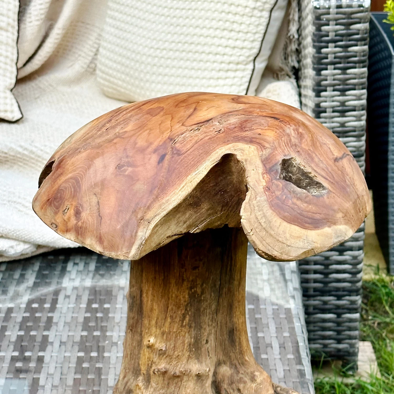 A hand carved tall rustic mushroom standing at 35cm height, made from recycled teak root wood with a smooth rounded top. This large heavy toadstool decoration is an outdoor piece suitable for year-round ornamental use that sparks natural rustic style into your garden.