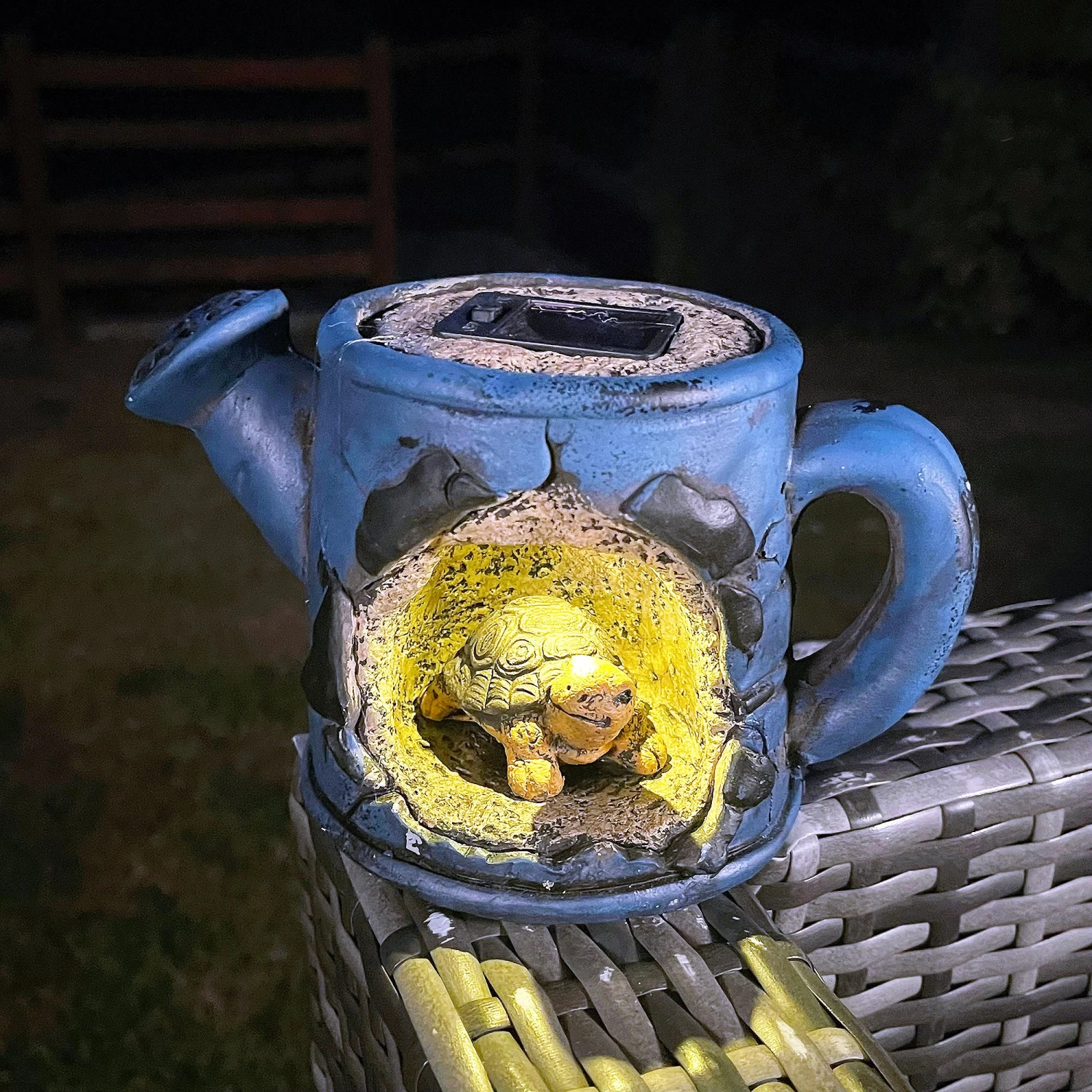 A solar garden ornament made from cement featuring a small tortoise in watering can design, gently lit during the nighttime. The solar light offers a warm white soft glow throughout the evening. It is weatherproof and suitable for year-round decoration.