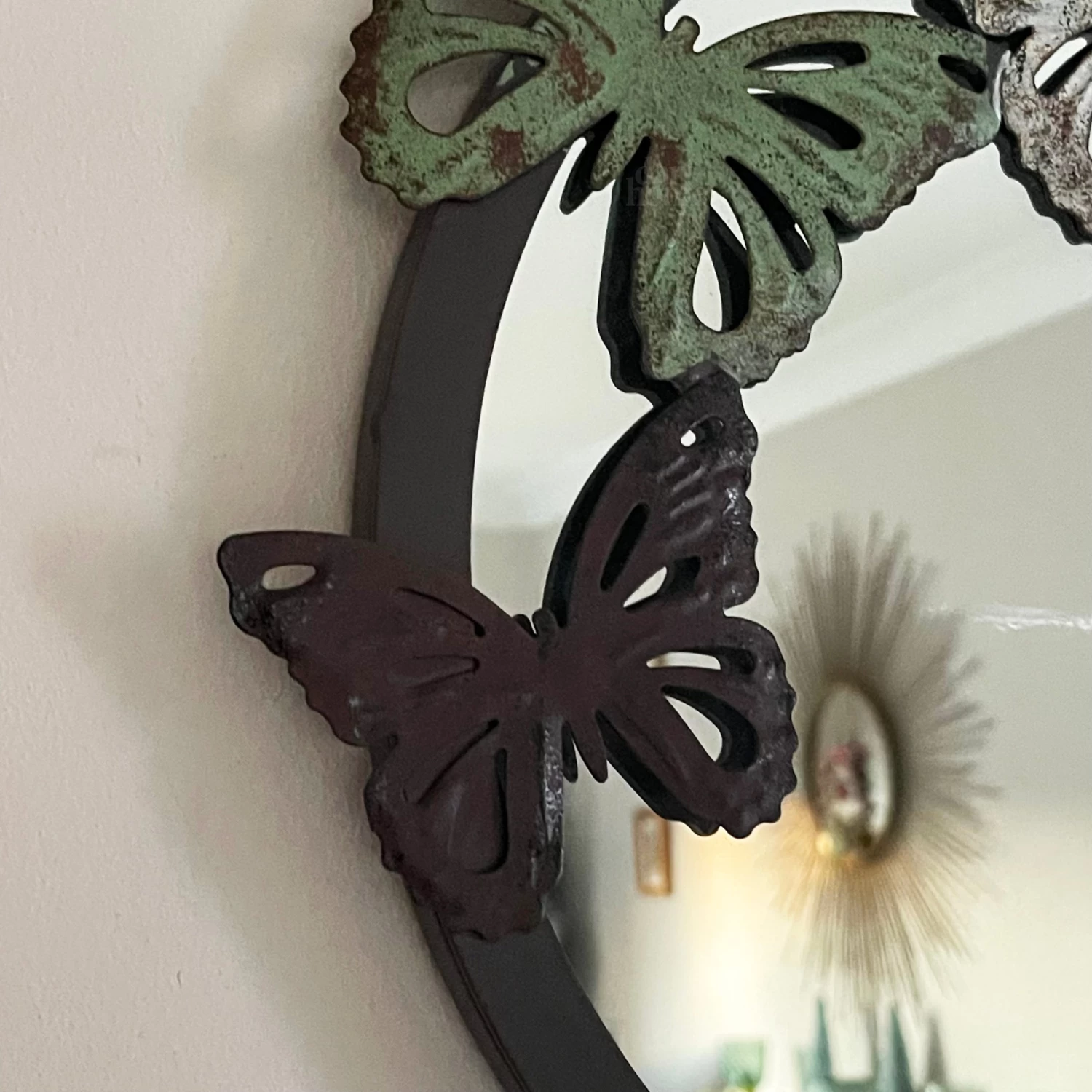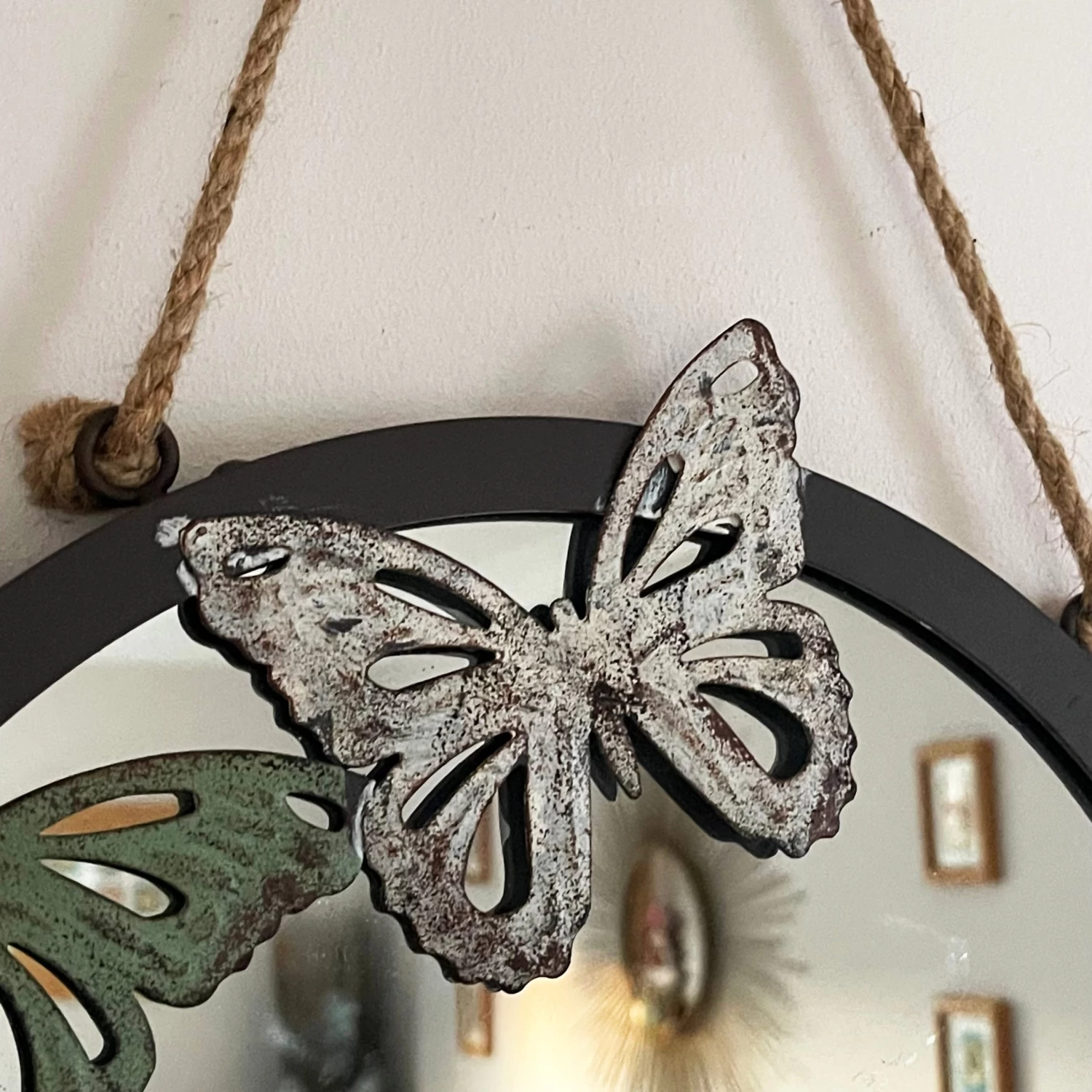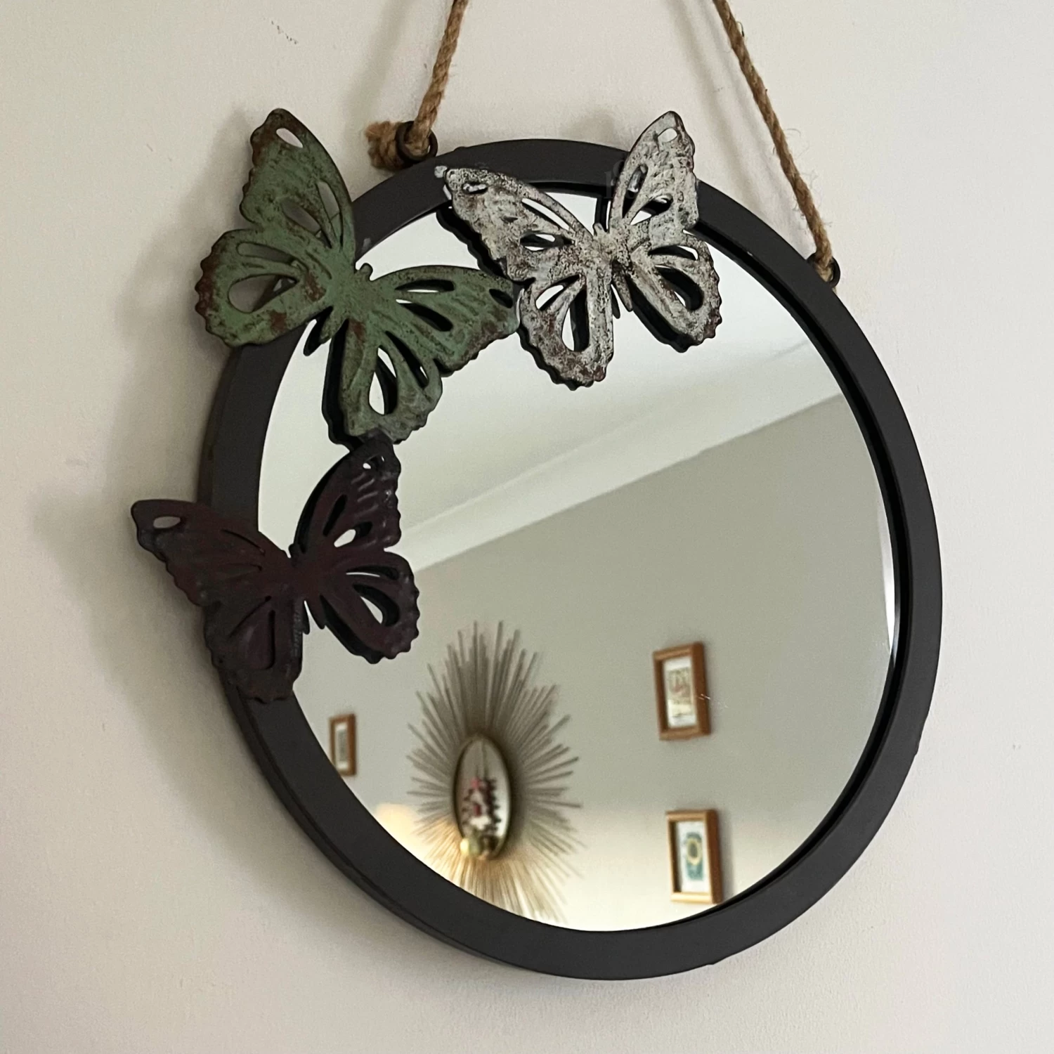 Round 26cm diameter wall mirror in a classic 32cm diameter butterfly trio design frame. Brown metal frame with distressed metal butterfly decorations around the frame, completed with a rope hanging to freely hang on any wall. Great for hallway or bedroom decorative use.