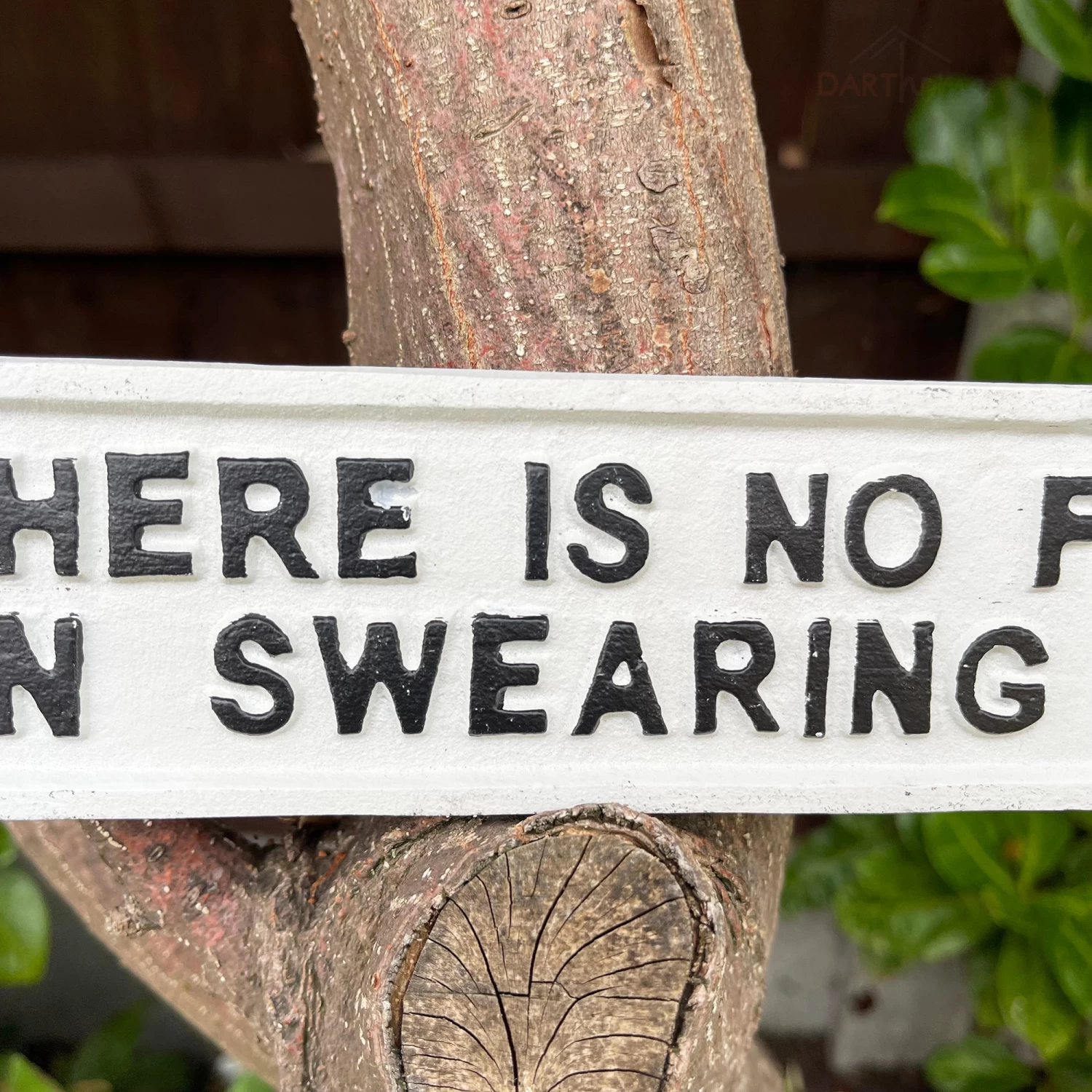 This wall mounted sign has a distressed vintage white finish. It is made from high quality cast iron, designed for outdoor use. The text reads ‘There Is No F In Swearing’. It will look great in your garden on the wall, on the gate or by the front door.