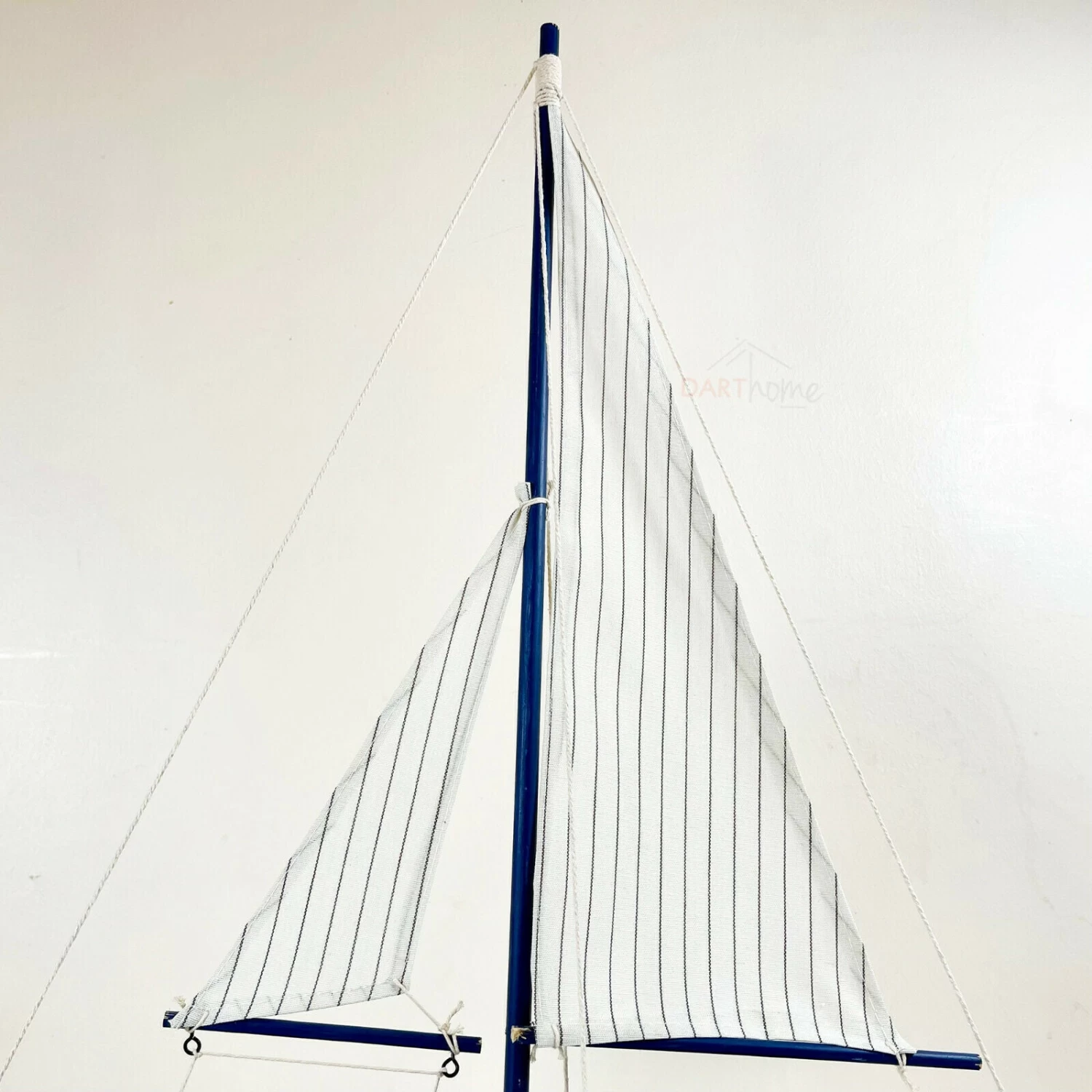 A stunning vintage style wooden made sailing yacht model with fabric sails. This ornament comes on a white rectangular stand. It is a great gift idea for a boat enthusiast. The boat is white with blue panels.