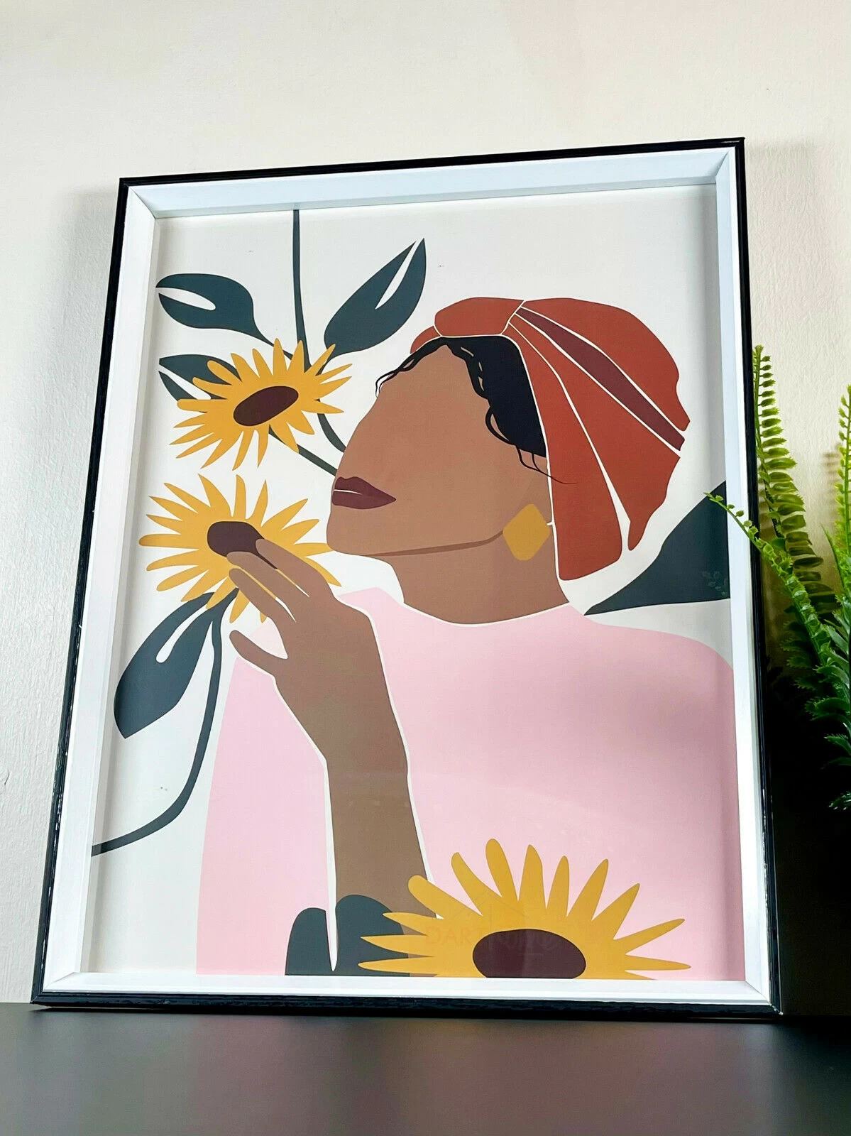 A moderism, abstract style print filled with subtle colour that will fit perfectly into your existing home decor. This framed print piece of wall art features a natural woman amongst some brightly coloured yellow sunflowers. This simple design offers a stylish addition to your home and can be placed on the wall of any room.