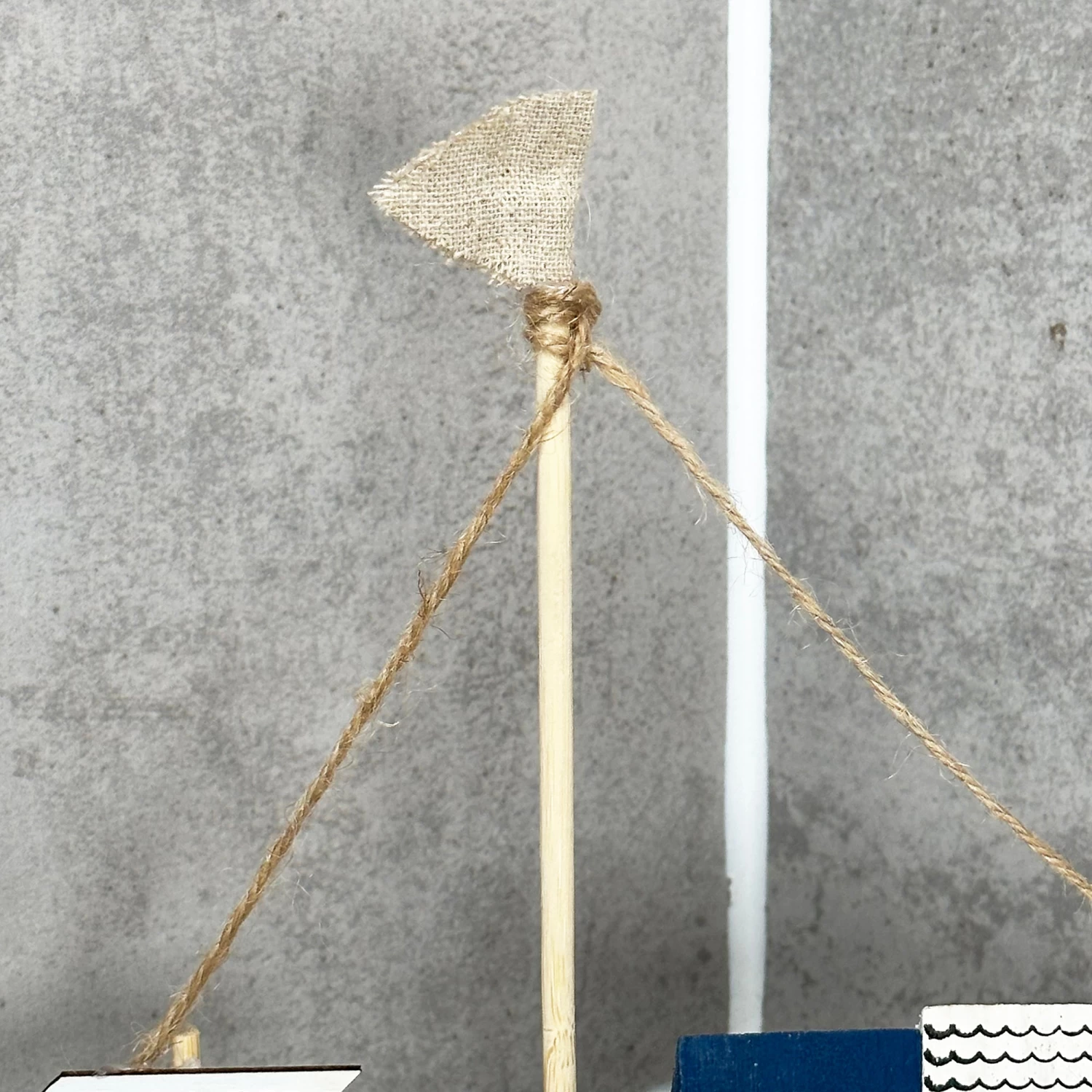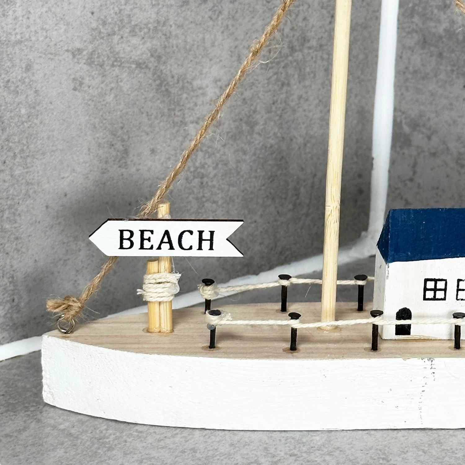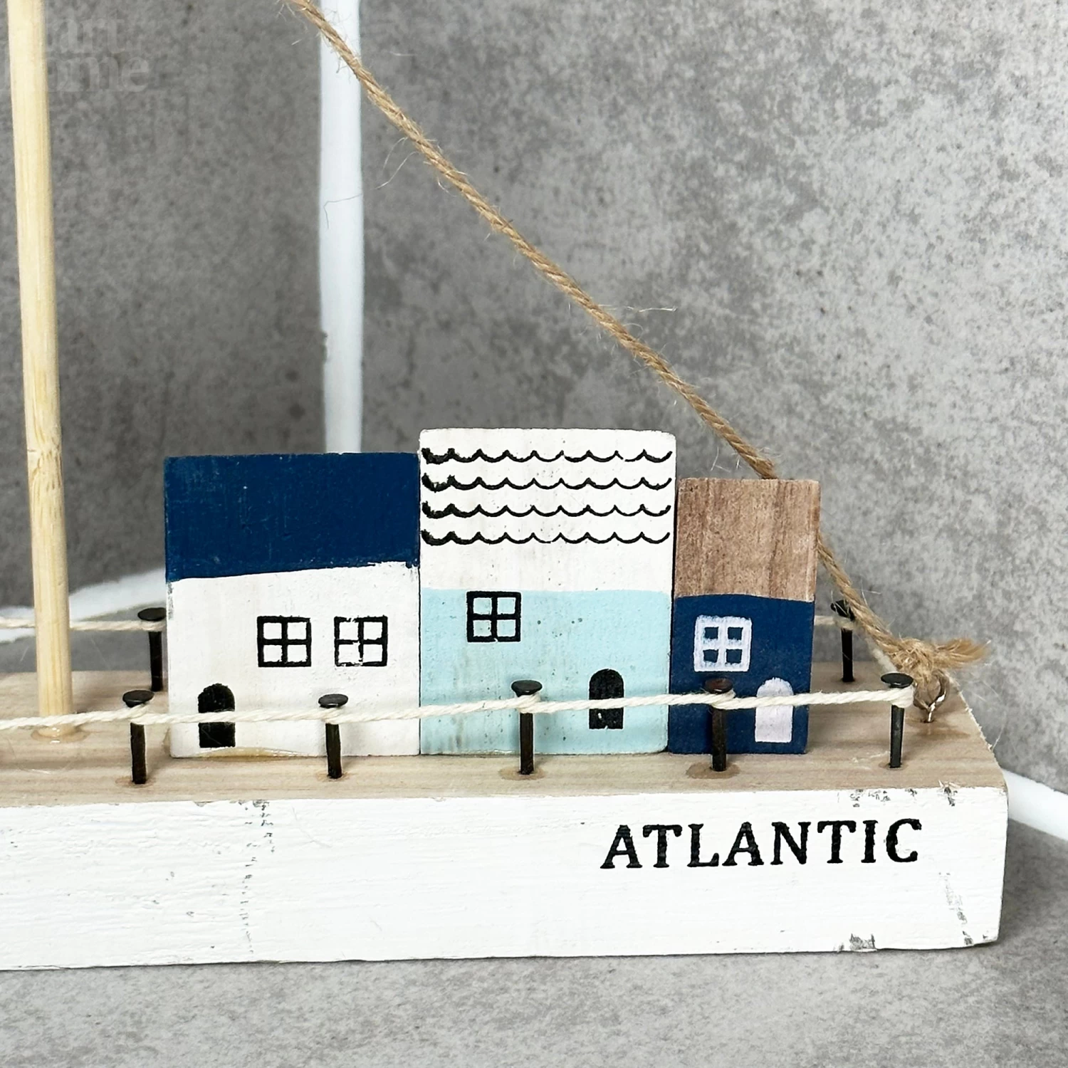 A nautical wooden made Atlantic boat featuring three blue boat houses. This ornament comes with a beach arrow sign along with string and canvas sails. It is a perfect sculpture for your bathroom nautical decor.
