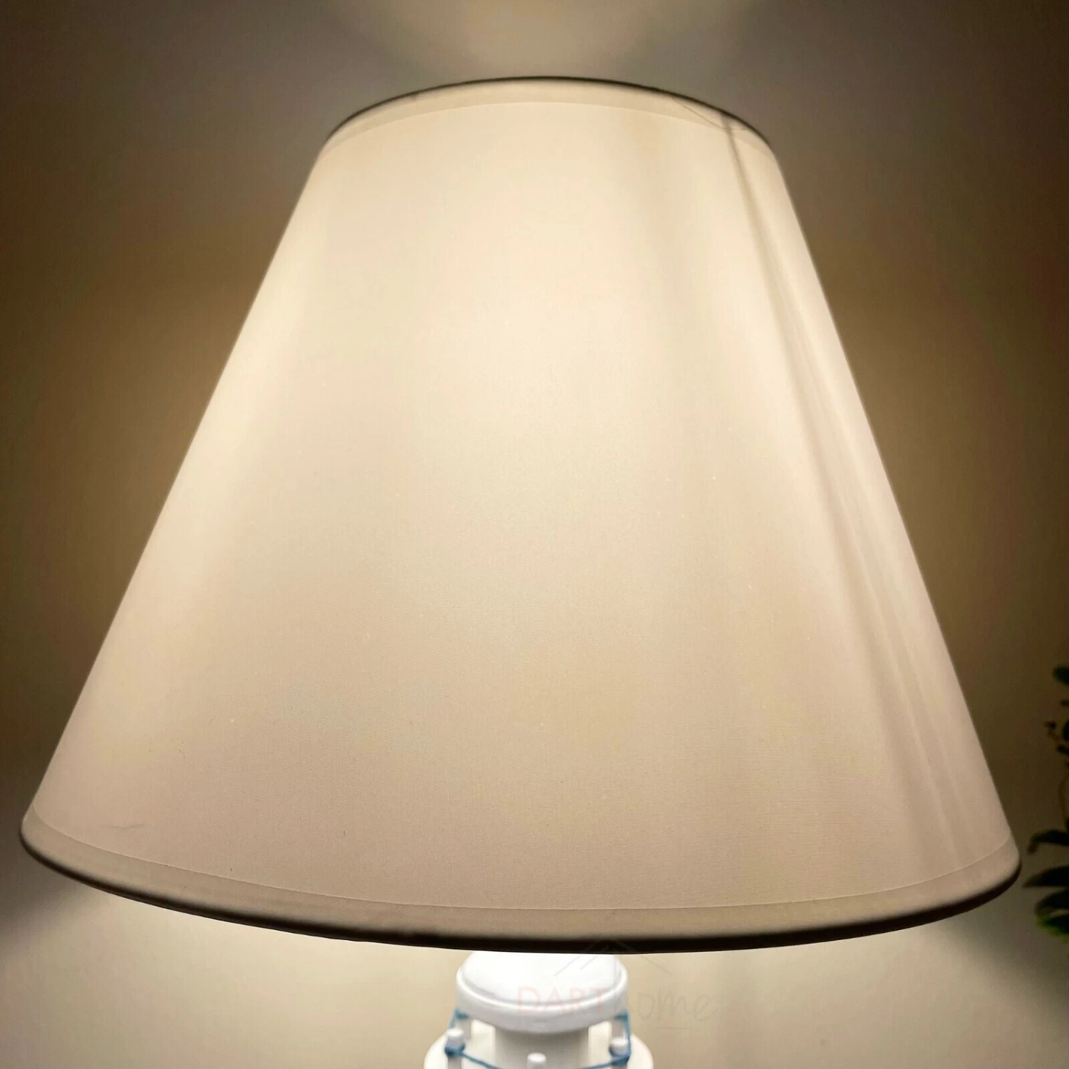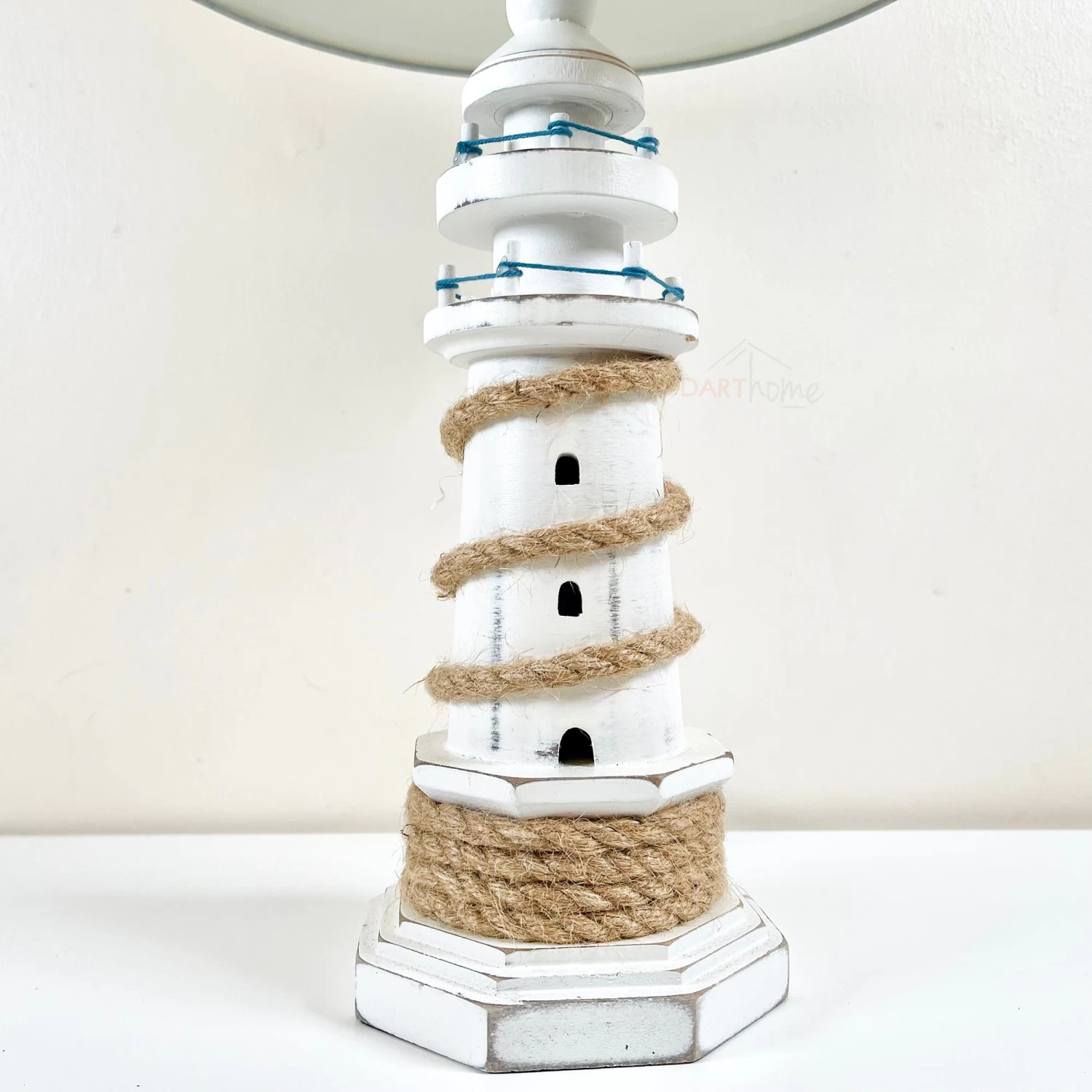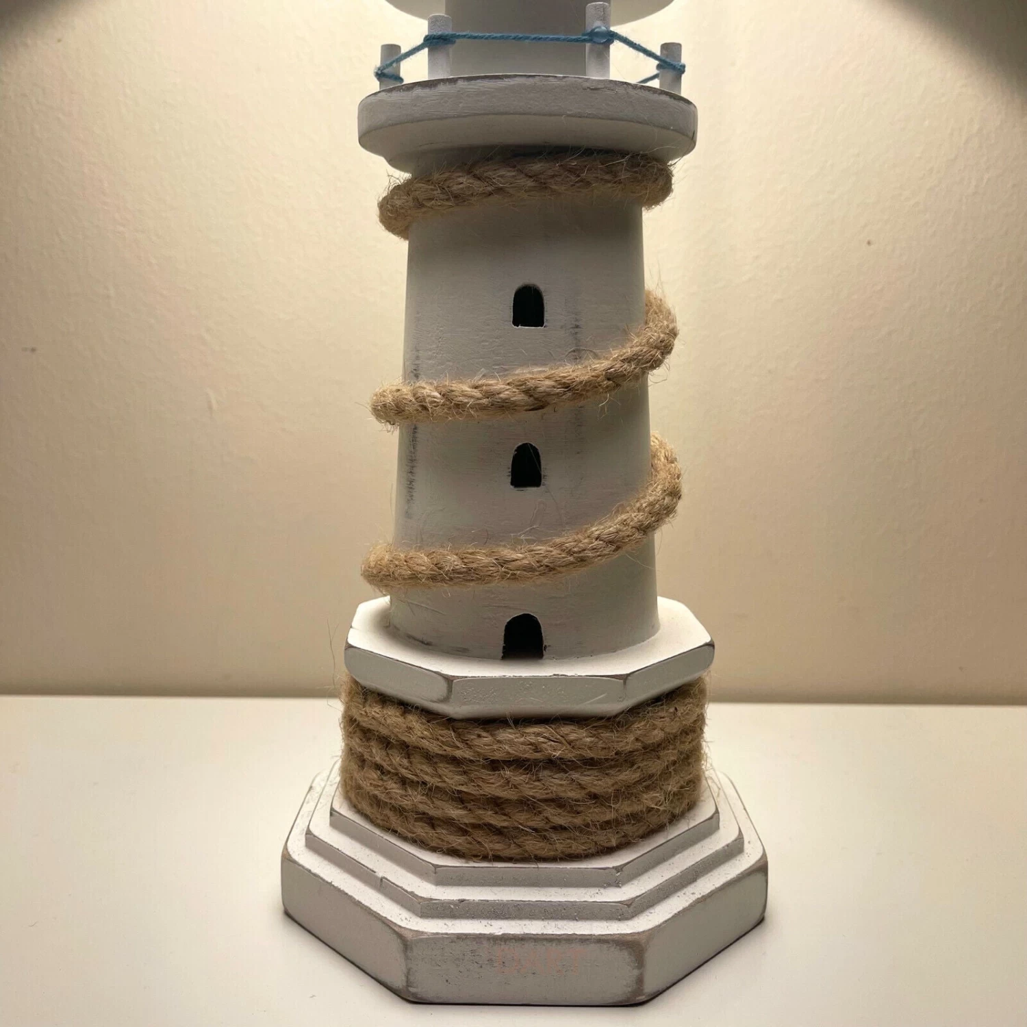 Nautical style bedside lamp perfect as a reading light. Brilliant novely white lighthouse wrapped in rope design made from wood and fabric in a traditional finish. 1 Bulb capacity, wall plug-in and on/off switch to control. Freestanding night light with fabric round shade offering a warm light colour when in use.