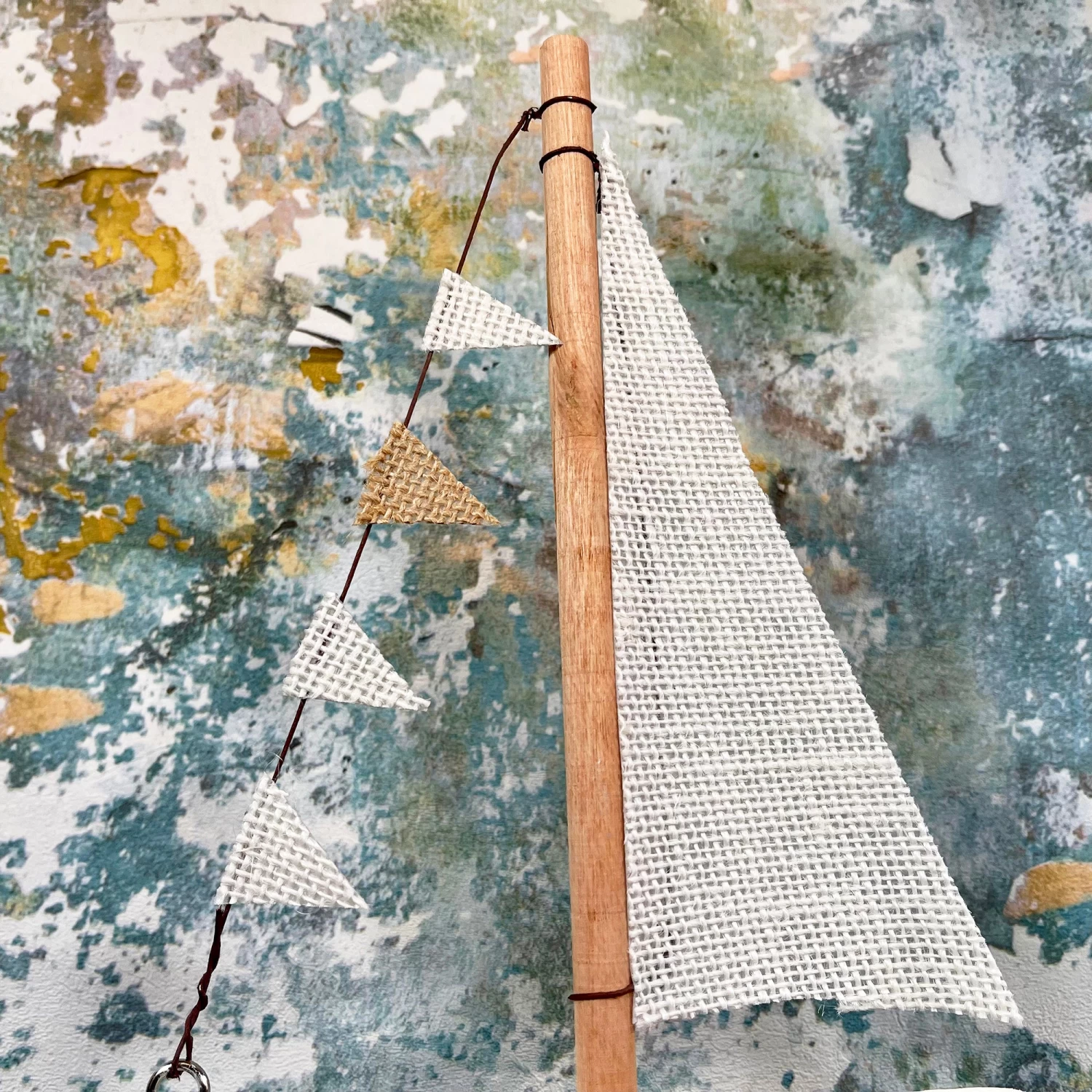 A wooden yacht sculpture with fabric sails, perfect for bathroom decoration to enhance your desired nautical style. Handmade from wood and distressed rustic finish and painted in blue and white to offer a seaside shabby chic style.