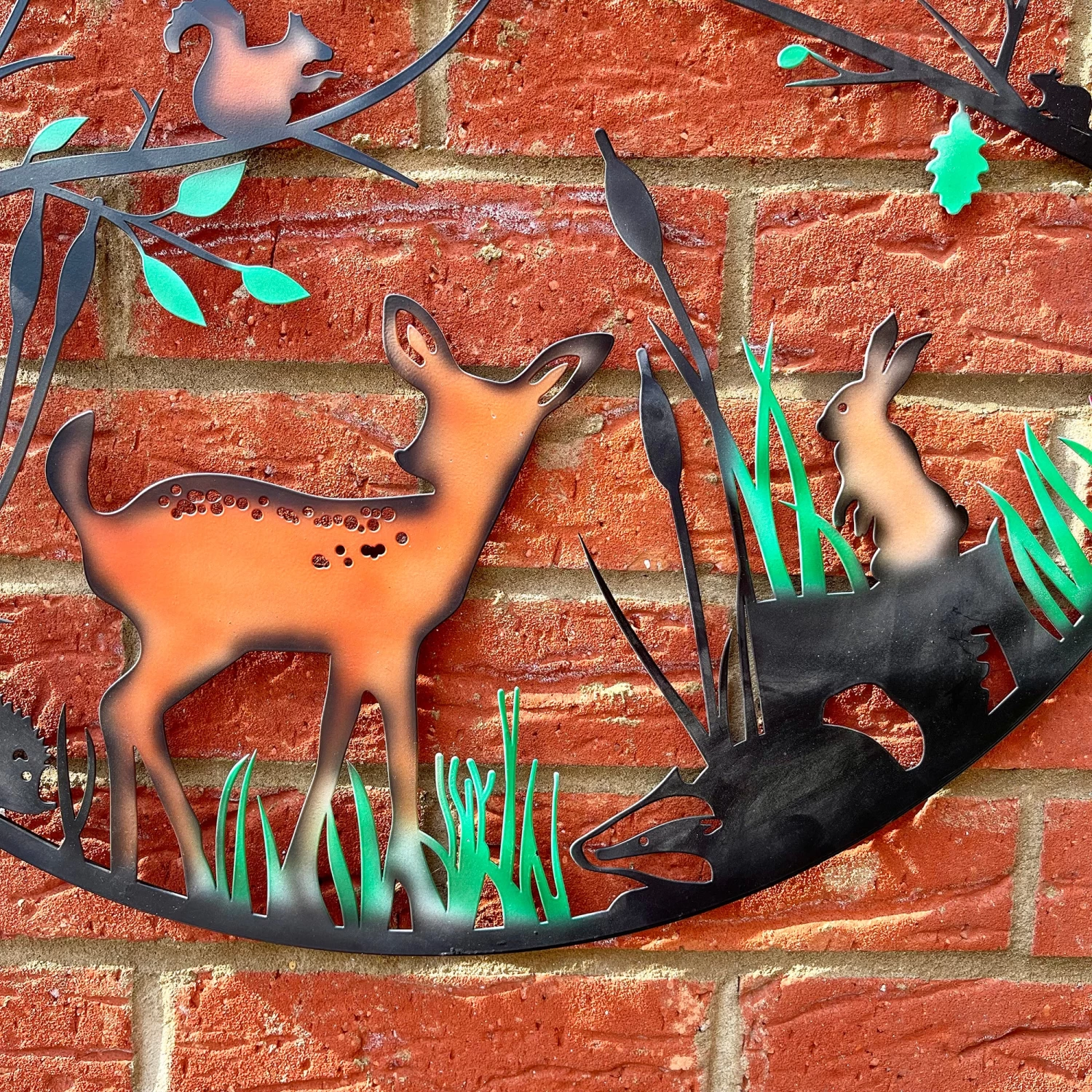 Wildlife themed garden wall art featuring an array of woodland animals like deer, owls and bunny rabbits to name a few. Filled with neatly placed splashes of colour throughout the animals, flowers and trees completely transforming this wall art and bringing everything in it to life. Its open design allows sun to shine through, also offering a glowing silhouette on the wall or fence of your garden space. Perfect gift idea for woodland wildlife lover and an easy decorative piece to personalise and colourise a garden space.