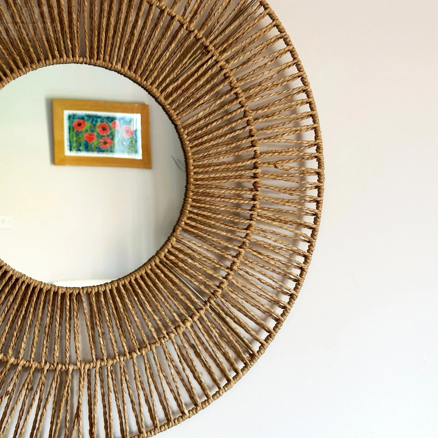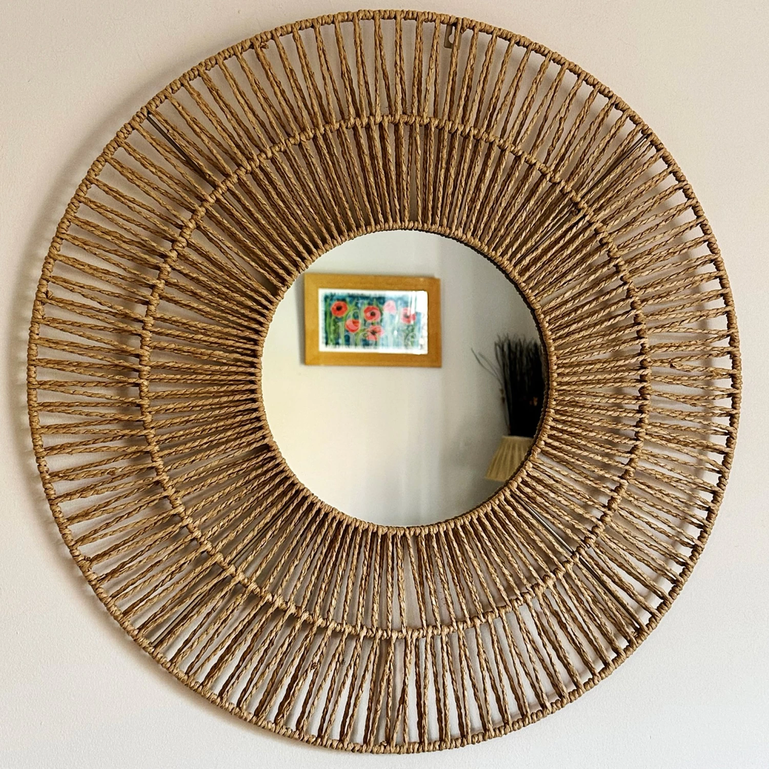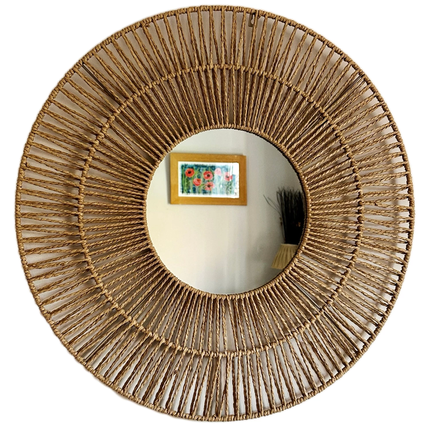 This beautiful rustic modern style round mirror made from woven paper rope and features a 28cm diameter interior round mirror. It is wall mounted with a rustic touch and lightweight weighing 700g making it a perfect item for above the fireplace and in the hallway.